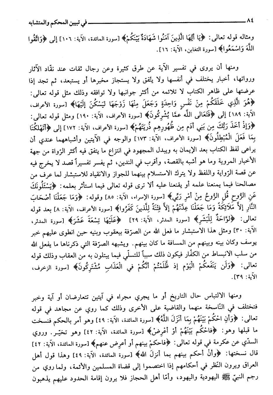 [سورة الأعراف، الآية: 173] والوجه في الآيتين وأشباههما عندي أن يراعى لفظ الكتاب بعد الإيمان به ويبدل المجهود في انتزاع ما يتفق فيه أكثر الرّواة من جهة الأخبار المروية وما هو أشبه بالقصة، وأقرب في الندين، ثم يفسر تفسيرا قصد لا يخرج فيه عن قصة الرّواية واللفظ ولا يترك الاستسلام بينهما للجواز والانقياد للاستبشار لما عرف من مصالحنا فيما يمنعنا علمه أو يقنعنا عليه ألا ترى قوله تعالى فيما استأثر بعلمه: يَسْئَلُونَكَ عَنِ الرُّوحِ قُلِ الرُّوحُ مِنْ أَمْرِ رَبِّي