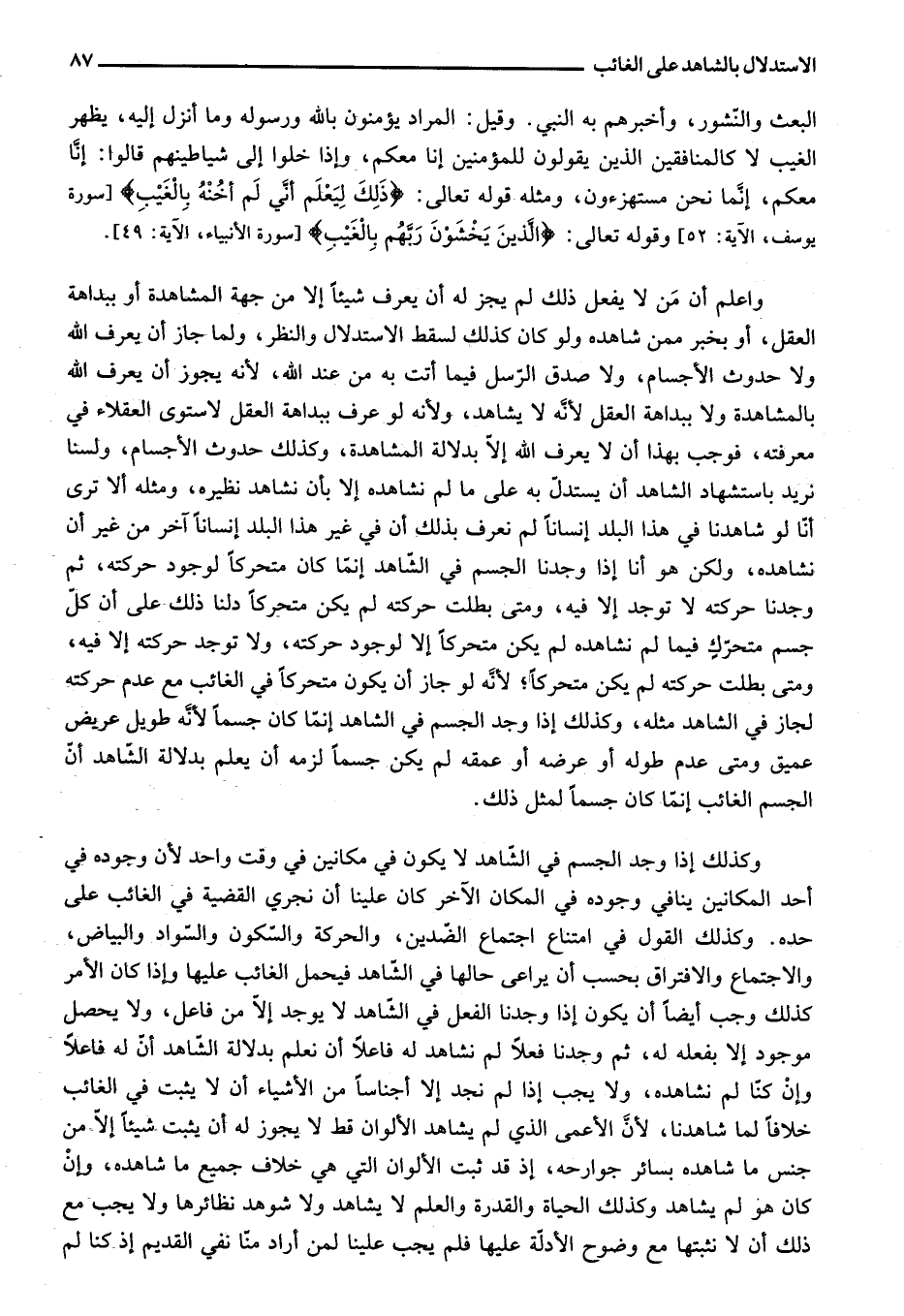واعلم أن من لا يفعل ذلك لم يجز له أن يعرف شيئا إلا من جهة المشاهدة أو ببداهة العقل، أو بخبر ممن شاهده ولو كان كذلك لسقط الاستدلال والنظر، ولما جاز أن يعرف الله ولا حدوث الأجسام، ولا صدق الرّسل فيما أتت به من عند الله، لأنه يجوز أن يعرف الله بالمشاهدة ولا ببداهة العقل لأنّه لا يشاهد، ولأنه لو عرف ببداهة العقل لاستوى العقلاء في معرفته، فوجب بهذا أن لا يعرف الله إلّا بدلالة المشاهدة، وكذلك حدوث الأجسام، ولسنا نريد باستشهاد الشاهد أن يستدلّ به على ما لم نشاهده إلا بأن نشاهد نظيره، ومثله ألا ترى أنّا لو شاهدنا في هذا البلد إنسانا لم نعرف بذلك أن في غير هذا البلد إنسانا آخر من غير أن نشاهده، ولكن هو أنا إذا وجدنا الجسم في الشّاهد إنّما كان متحركا لوجود حركته، ثم وجدنا حركته لا توجد إلا فيه، ومتى بطلت حركته لم يكن متحركا دلنا ذلك على أن كلّ جسم متحرّك فيما لم نشاهده لم يكن متحركا إلا لوجود حركته، ولا توجد حركته إلا فيه، ومتى بطلت حركته لم يكن متحركا؛ لأنّه لو جاز أن يكون متحركا في الغائب مع عدم حركته لجاز في الشاهد مثله، وكذلك إذا وجد الجسم في الشاهد إنّما كان جسما لأنّه طويل عريض عميق ومتى عدم طوله أو عرضه أو عمقه لم يكن جسما لزمه أن يعلم بدلالة الشّاهد أنّ الجسم الغائب إنمّا كان جسما لمثل ذلك.