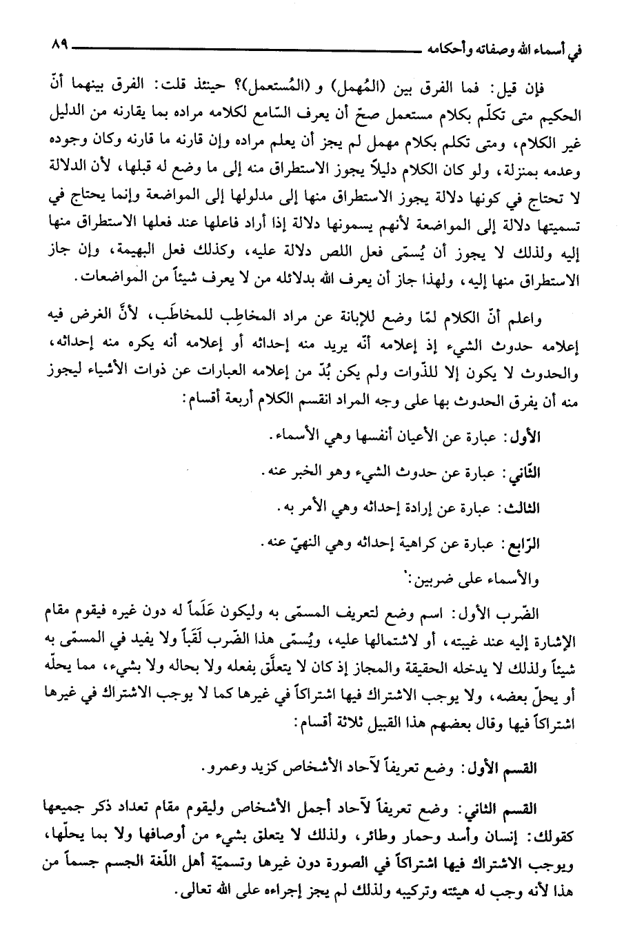 واعلم أنّ الكلام لمّا وضع للإبانة عن مراد المخاطب للمخاطب، لأنّ الغرض فيه إعلامه حدوث الشيء إذ إعلامه أنّه يريد منه إحداثه أو إعلامه أنه يكره منه إحداثه، والحدوث لا يكون إلا للذّوات ولم يكن بدّ من إعلامه العبارات عن ذوات الأشياء ليجوز منه أن يفرق الحدوث بها على وجه المراد انقسم الكلام أربعة أقسام: