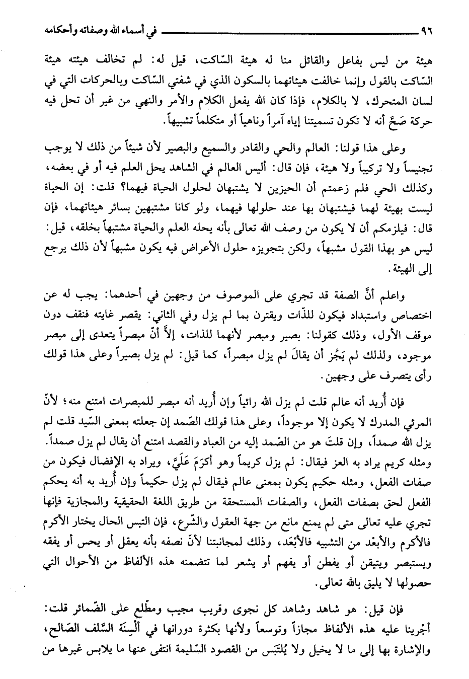 وعلى هذا قولنا: العالم والحي والقادر والسميع والبصير لأن شيئا من ذلك لا يوجب تجنيسا ولا تركيبا ولا هيئة، فإن قال: أليس العالم في الشاهد يحل العلم فيه أو في بعضه، وكذلك الحي فلم زعمتم أن الحيزين لا يشتبهان لحلول الحياة فيهما؟ قلت: إن الحياة ليست بهيئة لهما فيشتبهان بها عند حلولها فيهما، ولو كانا مشتبهين بسائر هيئاتهما، فإن قال: فيلزمكم أن لا يكون من وصف الله تعالى بأنه يحله العلم والحياة مشتبها بخلقه، قيل: