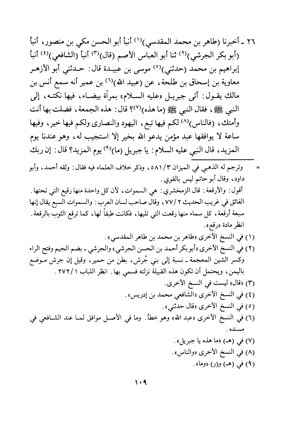 26- أَخْبَرَنَا (طَاهِرُ بْنُ مُحَمَّدٍ الْمَقْدِسِيُّ) (¬1) أَنْبَأَ أَبُو الْحَسَنِ مَكِّيُّ بْنُ مَنْصُورٍ، أَنْبَأَ (أَبُو بَكْرٍ الْجَرْشِيُّ) (¬2) ثَنَا أَبُو الْعَبَّاسِ الأَصَمُّ (قَالَ) (¬3) أَنْبَأَ (الشَّافِعِيُّ) (¬4) أَنْبَأَ إِبْرَاهِيمُ بْنُ مُحَمَّدٍ (حَدَّثَنِي) (¬5) مُوسَى بْنُ عُبَيْدَةَ قَالَ: حَدَّثَنِي أَبُو الأَزْهَرِ مُعَاوِيَةُ بْنُ إِسْحَاقَ بْنِ طَلْحَةَ، عَنْ (عُبَيْدِ اللَّهِ) (¬6) بْنِ عُمَيْرٍ أَنَّهُ سَمِعَ أَنَسَ بْنَ مَالِكٍ يَقُولُ: أَتَى جِبْرِيلُ "عَلَيْهِ السَّلَامُ" بِمِرْآةٍ بَيْضَاءَ، فِيهَا نُكْتَةٌ، إِلَى النَّبِيِّ صَلَّى اللَّهُ عَلَيْهِ وَسَلَّمَ، فَقَالَ النَّبِيُّ صَلَّى اللَّهُ عَلَيْهِ وَسَلَّمَ (مَا هَذِهِ) ؟ (¬7) قَالَ هَذِهِ الْجُمُعَةُ، فُضِّلْتَ بِهَا أَنْتَ وَأُمَّتُكَ، (فَالنَّاسُ) (¬8) لُكُمْ فِيهَا تَبَعٌ، الْيَهُودُ وَالنَّصَارَى وَلَكُمْ فِيهَا خَيْرٌ، وَفِيهَا سَاعَةٌ لَا يُوَافِقُهَا عَبْدٌ مُؤْمِنٌ يَدْعُو اللَّهَ بِخَيْرٍ إِلَّا اسْتُجِيبَ لَهُ، وَهُوَ عِنْدَنَا يَوْمُ الْمَزِيدِ، قَالَ النَّبِيُّ صَلَّى اللَّهُ عَلَيْهِ وَسَلَّمَ: يَا جِبْرِيلُ (مَا) (¬9) يَوْمُ الْمَزِيدِ؟ قَالَ: إِنَّ رَبَّكَ