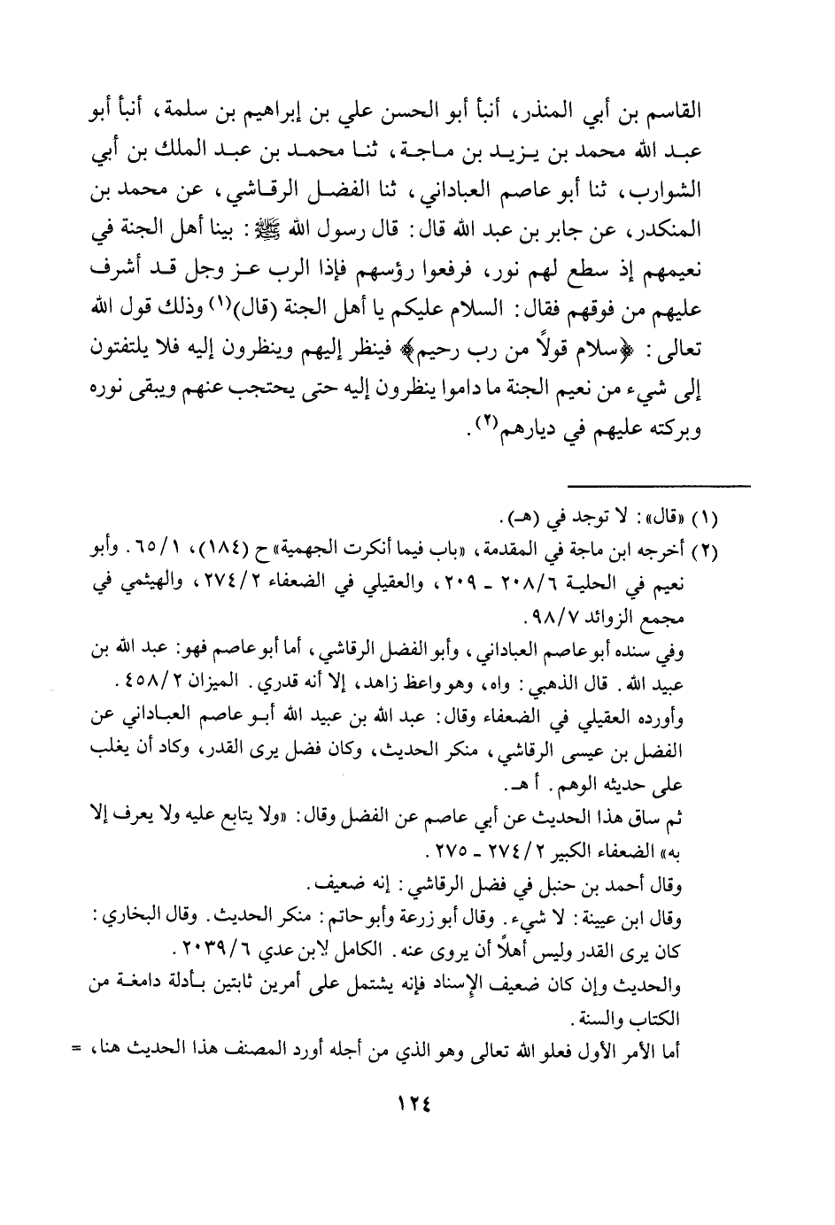 الْقَاسِمُ بْنُ أَبِي الْمُنْذِرِ، أَنْبَأَ أَبُو الْحَسَنِ عَلِيُّ بْنُ إِبْرَاهِيمَ بْنِ سَلَمَةَ، أَنْبَأَ أَبُو عَبْدِ اللَّهِ مُحَمَّدُ بْنُ يَزِيدَ بْنِ مَاجَةَ، ثَنَا مُحَمَّدُ بْنُ عَبْدِ الْمَلِكِ بْنِ أَبِي الشَّوَارِبِ، ثَنَا أَبُو عَاصِمٍ الْعَبَّادَانِيُّ، ثَنَا الْفَضْلُ الرَّقَاشِيُّ، عَنْ مُحَمَّدِ بْنِ الْمُنْكَدِرِ، عَنْ جَابِرِ بْنِ عَبْدِ اللَّهِ قَالَ: قَالَ رَسُولُ اللَّهِ صَلَّى اللَّهُ عَلَيْهِ وَسَلَّمَ: بَيْنَا أَهْلُ الْجَنَّةِ فِي نَعِيمِهِمْ إِذْ سَطَعَ لَهُمْ نور، فرفعوا رؤسهم فَإِذَا الرَّبُّ عَزَّ وَجَلَّ قَدْ أَشْرَفَ عَلَيْهِمْ مِنْ فَوْقِهِمْ، فَقَالَ: السَّلَامُ عَلَيْكُمْ يَا أَهْلَ الْجَنَّةِ (قَالَ) (¬1) : وَذَلِكَ قَوْلُ اللَّهِ تَعَالَى: {سَلامٌ قَوْلا مِنْ رَبٍّ رَحِيمٍ} (¬2) ، فَيَنْظُرُ إِلَيْهِمْ وَيَنْظُرُونَ إِلَيْهِ، فَلَا يَلْتَفِتُونَ إِلَى شَيْءٍ مِنْ نَعِيمِ الْجَنَّةِ مَا دَامُوا يَنْظُرُونَ إِلَيْهِ حَتَّى يَحْتَجِبَ عَنْهُمْ، وَيَبْقَى نُورُهُ وَبَرَكَتُهُ عَلَيْهِمْ فِي دِيَارِهِمْ (¬3) .