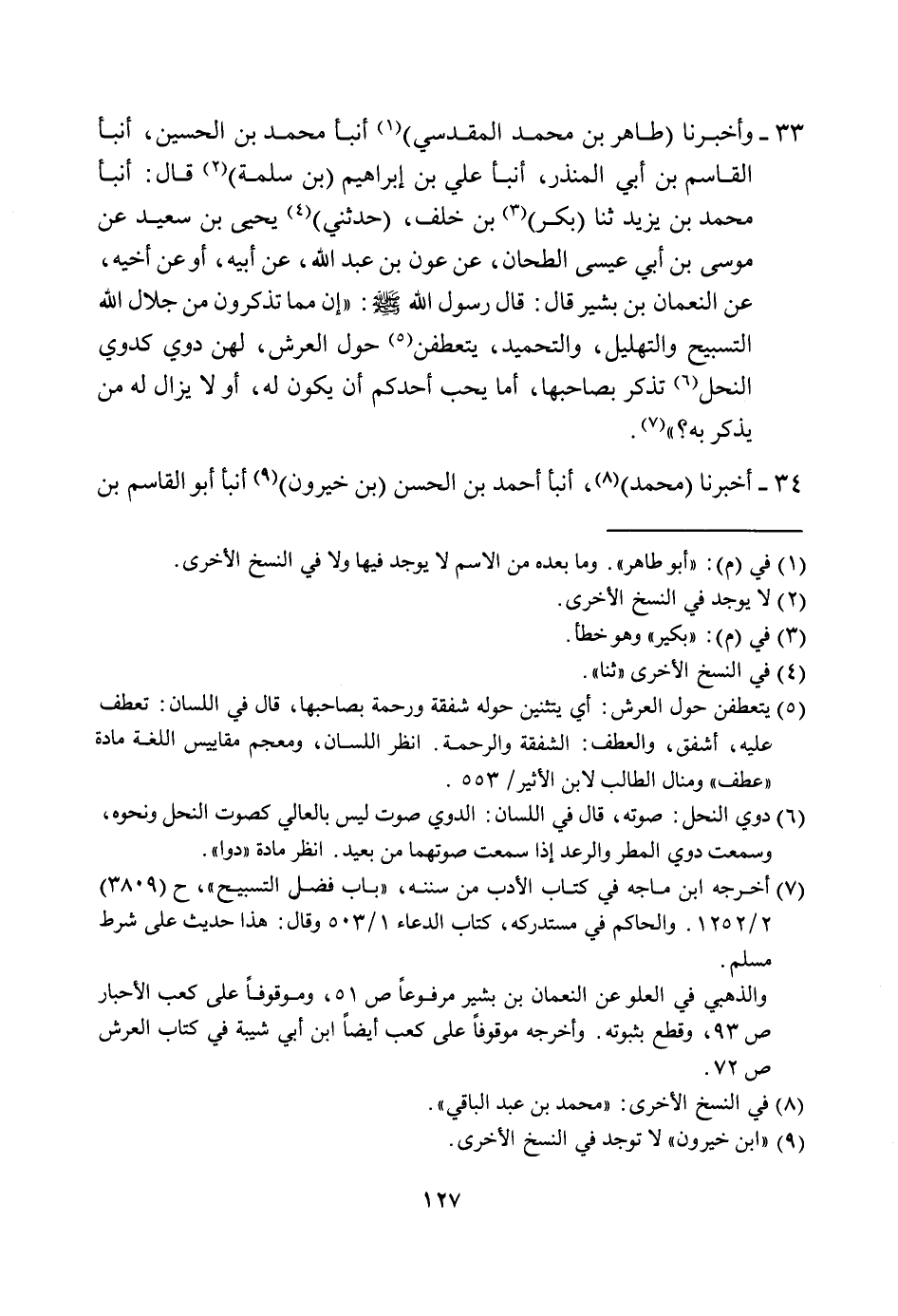 33- وَأَخْبَرَنَا (طَاهِرُ بْنُ مُحَمَّدٍ الْمَقْدِسِيُّ) (¬1) أَنْبَأَ مُحَمَّدُ بْنُ الْحُسَيْنِ، أَنْبَأَ الْقَاسِمُ بْنُ أَبِي الْمُنْذِرِ، أَنْبَا عَلِيُّ بْنُ إِبْرَاهِيمَ (بْنِ سَلَمَةَ) (¬2) ، قَالَ: أَنْبَأَ مُحَمَّدُ بْنُ يَزِيدَ ثَنَا (بَكْرُ) (¬3) بْنُ خَلَفٍ، (حَدَّثَنِي) (¬4) يَحْيَى بْنُ سَعِيدٍ عَنْ مُوسَى بْنِ أَبِي عِيسَى الطَّحَّانِ، عَنْ عَوْنِ بْنِ عَبْدِ اللَّهِ، عَنْ أَبِيهِ، أَوْ عَنْ أَخِيهِ، عَنِ النُّعْمَانِ بْنِ بَشِيرٍ، قَالَ: قَالَ رَسُولُ اللَّهِ صَلَّى اللَّهُ عَلَيْهِ وَسَلَّمَ: "إِنَّ مِمَّا تَذْكُرُونَ مِنْ جَلَالِ اللَّهِ التَّسْبِيحَ والتهليل، والتحميد، بتعطفن (¬5) حَوْلَ الْعَرْشِ، لَهُنَّ دَوِيٌّ كَدَوِيِّ النَّحْلِ (¬6) تُذَكِّرُ بِصَاحِبِهَا، أَمَا يُحِبُّ أَحَدُكُمْ أَنْ يَكُونَ لَهُ، أَوْ يَزَالُ له من ذكر بِهِ؟ " (¬7) .