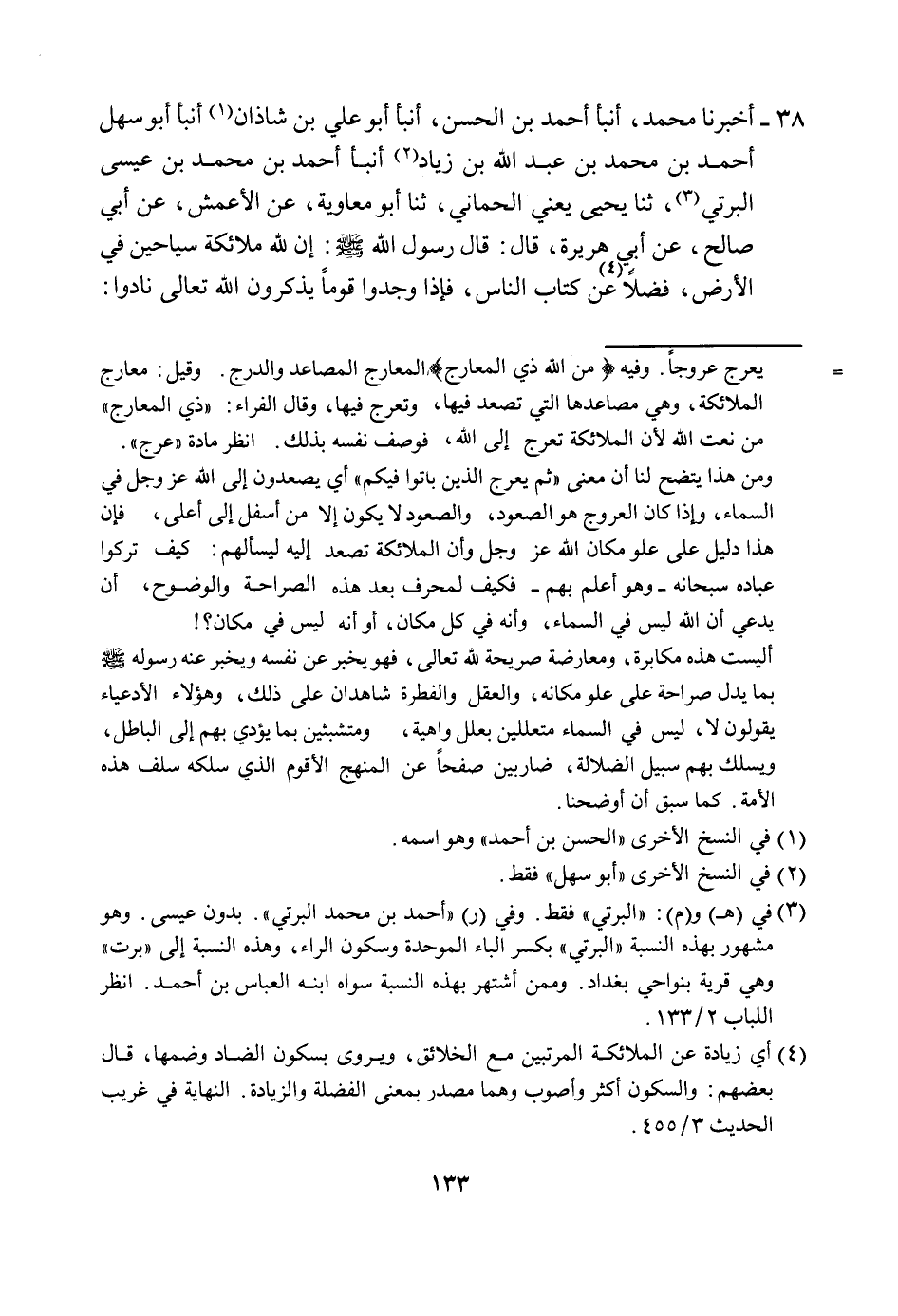 38- أَخْبَرَنَا مُحَمَّدٌ، أَنْبَا أَحْمَدُ بْنُ الْحَسَنِ، أَنْبَأَ أَبُو عَلِيِّ بْنُ شَاذَانَ (¬1) ، أَنْبَأَ أَبُو سَهْلٍ أَحْمَدُ بْنُ مُحَمَّدِ بْنِ عَبْدِ اللَّهِ بْنِ زِيَادٍ (¬2) ، أَنْبَأَ أَحْمَدُ بْنُ مُحَمَّدِ بْنِ عِيسَى الْبَرْتِيُّ (¬3) ، ثَنَا يَحْيَى يَعْنِي الحماني، ثنا أبو مُعَاوِيَةُ، عَنِ الأَعْمَشِ، عَنْ أَبِي صَالِحٍ، عَنْ أَبِي هُرَيْرَةَ، قَالَ: قَالَ رَسُولُ اللَّهِ صَلَّى اللَّهُ عَلَيْهِ وَسَلَّمَ: إِنَّ لِلَّهِ مَلَائِكَةً سَيَّاحِينَ فِي الأَرْضِ، فَضْلًا (¬4) عَنْ كُتَّابِ النَّاسِ، فَإِذَا وَجَدُوا قَوْمًا يَذْكُرُونَ اللَّهَ تَعَالَى نَادَوْا: