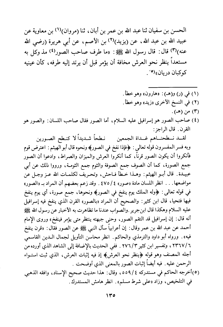 وبه فسر المفسرون قوله تعالى: {فَإِذَا نُفِخَ فِي الصُّورِ} (المؤمنون: من الآية: 101) ، ونحوه قال أبو الهيثم: اعترض قوم فأنكروا أن يكون الصور قرنا، كما أنكرو العرش والميزان والصراط، وادعوا أن الصور جمع الصورة، كما أن الصوف جمع الصوفة، والثوم جمع الثومة، ورووا ذلك عن أبي عبيدة. قال أبو الهيثم: وهذا خطأ فاحش، وتحريف لكلمات الله عز وجل عن مواضعها ... انظر: اللسان، مادة: "صور" 4/475. وقد زعم بعضهم أن المراد بـ "الصور" في قوله تعالى: {وَلَهُ الْمُلْكُ يَوْمَ يُنْفَخُ فِي الصُّور} (الأنعام: من الآية: 73) ، ونحوها، جمع صورة، أي ينفخ فيها فتحيا، قال ابن كثير: والصحيح أن المراد بالصور القرن الذي ينفخ فيه إسرافيل عليه السلام، وهكذا قال ابن جرير. والصواب عندنا ما تظاهرت به الأخبار عن رسول الله صَلَّى اللَّهُ عَلَيْهِ وَسَلَّمَ أنه قال: إن إسرافيل قد التقم الصور، وحنى جبهته ينتظر متى يؤمر فينفخ"، وروى الإمام أحمد عن عبد الله بن عمر، قال: إن أعرابيا سأل النبي صَلَّى اللَّهُ عَلَيْهِ وَسَلَّمَ عن الصور، فقال: "قرن ينفخ فيه". ورواه أبو داود، والترمذي، والحاكم. انظر: محاسن التأويل لجمال الدين القاسمي 6/2367، وتفسير ابن كثير 3/276. ففي الحديث بالإضافة إلى الشاهد الذي أورده من أجله المصنف وهو قوله: "ينظر نحو العرش" إذ فيه إثبات العرش، الذي ثبت استواء الرحمن عليه. فيه أيضا إثبات الصور بالمعنى الذي أوضحت.