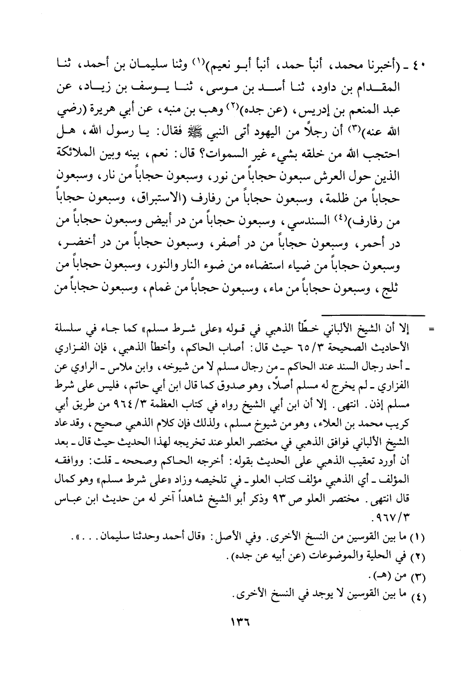 40- (أَخْبَرَنَا محمد، أنبأ حمد، أَنْبَا أَبُو نُعَيْمٍ) (¬1) ، وَثَنَا سُلَيْمَانُ بْنُ أحمد، ثنا المقدام بْنُ دَاوُدَ، ثَنَا أَسَدُ بْنُ مُوسَى، ثَنَا يُوسُفُ بْنُ زِيَادٍ، عَنْ عَبْدِ الْمُنْعِمِ بْنِ إِدْرِيسَ، (عَنْ جَدِّهِ) (¬2) وَهْبِ بْنِ مُنَبِّهٍ، عَنْ أَبِي هُرَيْرَةَ (رَضِيَ اللَّهُ عَنْهُ) (¬3) ، أَنَّ رَجُلًا مِنَ الْيَهُودِ أَتَى النَّبِيَّ صَلَّى اللَّهُ عَلَيْهِ وَسَلَّمَ فَقَالَ: يَا رَسُولَ اللَّهِ، هَلِ احْتَجَبَ اللَّهُ مِنْ خَلْقِهِ بشيء غير السموات؟ قَالَ: نَعَمْ، بَيْنَهُ وَبَيْنَ الْمَلَائِكَةِ الَّذِينَ حَوْلَ الْعَرْشِ سَبْعُونَ حِجَابًا مِنْ نُورٍ، وَسَبْعُونَ حِجَابًا مِنْ نَارٍ، وَسَبْعُونَ حِجَابًا مِنْ ظُلْمَةٍ، وَسَبْعُونَ حِجَابًا مِنْ رَفَارِفِ (الاستبراق، وَسَبْعُونَ حِجَابًا مِنْ رَفَارِفِ) (¬4) السُّنْدُسِيِّ، وَسَبْعُونَ حِجَابًا مِنْ دُرٍّ أَبْيَضَ، وَسَبْعُونَ حِجَابًا مِنْ دُرٍّ أَحْمَرَ، وَسَبْعُونَ حِجَابًا مِنْ دُرٍّ أَصْفَرَ، وَسَبْعُونَ حِجَابًا من در أحضر، وَسَبْعُونَ حِجَابًا مِنْ ضِيَاءٍ اسْتِضَاءَهُ مِنْ ضَوْءِ النَّارِ وَالنُّورِ، وَسَبْعُونَ حِجَابًا مِنْ ثَلْجٍ، وَسَبْعُونَ حِجَابًا مِنْ مَاءٍ، وَسَبْعُونَ حِجَابًا مِنْ غَمَامٍ، وَسَبْعُونَ حِجَابًا مِنْ