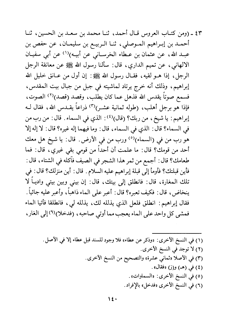 43- (ومن كتاب العرش قَالَ أَحْمَدُ، ثَنَا مُحَمَّدُ بْنُ سَعْدِ بْنِ الْحُسَيْنِ، ثَنَا أَحْمَدُ بْنُ إِبْرَاهِيمَ الْمَوْصِلِيُّ، ثَنَا الرَّبِيعُ بْنُ سُلَيْمَانَ، عَنْ حَفْصِ بْنِ عَبْدِ اللَّهِ، عَنْ عُثْمَانَ بن عطاء الخرساني عَنْ أَبِيهِ) (¬1) ، عَنْ أَبِي سُفْيَانَ الأَلْهَانِيِّ، عَنْ تَمِيمٍ الدَّارِيِّ، قَالَ: سَأَلْنَا رَسُولَ اللَّهِ صَلَّى اللَّهُ عَلَيْهِ وَسَلَّمَ عَنْ مُعَانَقَةِ الرَّجُلِ الرَّجُلَ، إِذَا هُوَ لَقِيَهُ، فَقَالَ رَسُولُ اللَّهِ صَلَّى اللَّهُ عَلَيْهِ وَسَلَّمَ: إِنَّ أَوَّلَ مَنْ عَانَقَ خَلِيلُ اللَّهِ إِبْرَاهِيمُ، وَذَلِكَ أَنَّهُ خَرَجَ يَرْتَادُ لِمَاشِيَتِهِ فِي جَبَلٍ مِنْ جِبَالِ بَيْتِ الْمَقْدِسِ، فَسَمِعَ صَوْتًا يُقَدِّسُ اللَّهَ فَذَهَلَ عَمَّا كَانَ يطلب، وقصد (قصد) (¬2) الصَّوْتَ، فَإِذَا هُوَ بِرَجُلٍ أَهْلَبٍ، (طُولُهُ ثَمَانِيَةَ عَشَرَ) (¬3) ذِرَاعًا يُقَدِّسُ اللَّهَ، فَقَالَ لَهُ إِبْرَاهِيمُ: يَا شَيْخُ، مَنْ رَبُّكَ؟ (قَالَ) (¬4) : الَّذِي فِي السَّمَاءِ. قَالَ: مَنْ رَبُّ مَنْ فِي السماء؟ قَالَ: الَّذِي فِي السَّمَاءِ، قَالَ: وَمَا فِيهِمَا إِلَهٌ غَيْرُهُ؟ قَالَ: لَا إِلَهَ إِلَّا هُوَ رَبُّ مَنْ فِي (السَّمَاءِ) (¬5) ، وَرَبُّ مَنْ فِي الأَرْضِ. قَالَ: يَا شَيْخُ هَلْ مَعَكَ أَحَدٌ مِنْ قَوْمِكَ؟ قَالَ: مَا عَلِمْتُ أَنَّ أَحَدًا مِنْ قَوْمِي بَقِيَ غَيْرِي، قَالَ: فَمَا طَعَامُكَ؟ قَالَ: أَجْمَعُ مِنْ ثَمَرِ هَذَا الشَّجَرِ فِي الصَّيْفِ، فَآكُلُهُ فِي الشِّتَاءِ، قَالَ: فَأَيْنَ قِبْلَتُكَ؟ فَأَوْمَأَ إِلَى قِبْلَةِ إِبْرَاهِيمَ عَلَيْهِ السَّلَامُ. قَالَ: أَيْنَ مَنْزِلُكَ؟ قَالَ فِي تِلْكَ الْمَغَارَةِ، قَالَ: فَانْطَلِقْ إِلَى بَيْتِكَ، قَالَ: إِنَّ بَيْنِي وَبَيْنَ بَيْتِي وَادِيًا لَا ينخاض، قال: فيكف تَعْبُرُهُ؟ قَالَ: أَعْبُرُ عَلَى الْمَاءِ ذَاهِبًا، وَأَعْبُرُ عَلَيْهِ جَائِيًا. فَقَالَ إِبْرَاهِيمُ: انْطَلِقْ فَلَعَلَّ الَّذِي يُذَلِّلُهُ لَكَ، يُذَلِّلُهُ لِي، فَانْطَلَقَا فَأَتَيَا الْمَاءَ فَمَشَى كُلُّ وَاحِدٍ عَلَى الْمَاءِ يَعْجَبُ مِمَّا أُوتِيَ صَاحِبُهُ، (فَدَخَلَا) (¬6) إِلَى الْغَارِ،