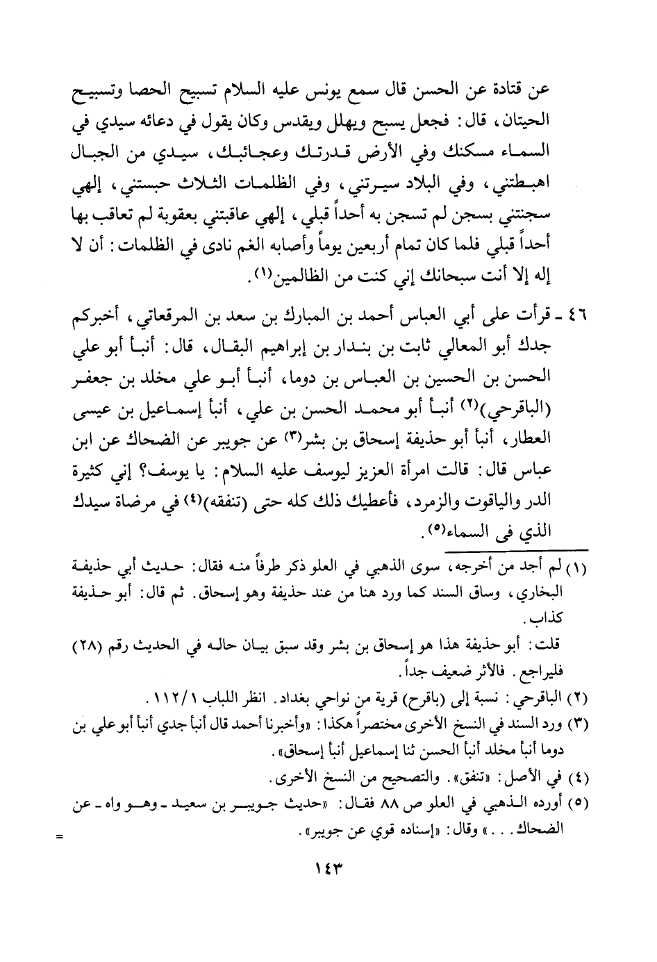 (¬5) أورده الذهبي في العلو ص 88، فقال: "حديث جويبر بن سعيد -وهو واه- عن الضحاك ... ". وقال: "إسناده قوي عن جويبر".