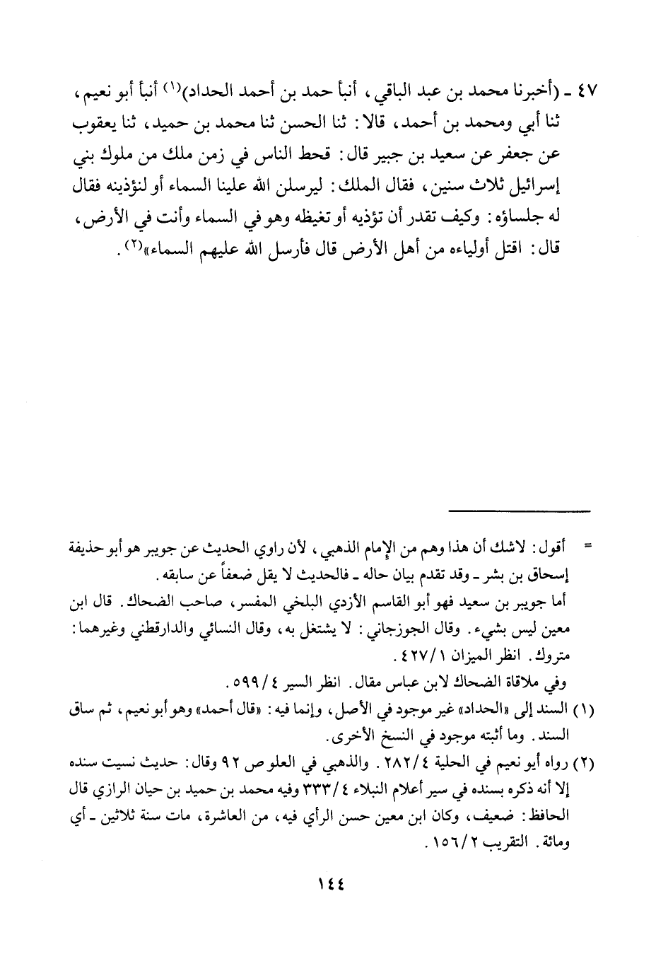 47- (أَخْبَرَنَا مُحَمَّدُ بْنُ عَبْدِ الْبَاقِي، أَنْبَأَ حَمَدُ بْنُ أَحْمَدَ الْحَدَّادُ) (¬1) ، أَنْبَأَ أَبُو نُعَيْمٍ، ثَنَا أَبِي وَمُحَمَّدُ بْنُ أَحْمَدَ، قَالَا: ثَنَا الْحَسَنُ، ثَنَا مُحَمَّدُ بْنُ حُمَيْدٍ، ثَنَا يَعْقُوبُ عَنْ جَعْفَرٍ عَنْ سَعِيدِ بْنِ جُبَيْرٍ، قَالَ: قَحَطَ النَّاسُ فِي زَمَنِ مَلِكٍ مِنْ مُلُوكِ بَنِي إِسْرَائِيلَ ثَلَاثَ سِنِينَ، فَقَالَ الْمَلِكُ: لَيُرْسِلَنَّ اللَّهُ عَلَيْنَا السَّمَاءَ أَوْ لَنُؤْذِيَنَّهُ، فَقَالَ لَهُ جلساؤه: وكيف نقدر أَنْ تُؤْذِيَهُ، أَوْ تُغِيظَهُ، وَهُوَ فِي السَّمَاءِ وَأَنْتَ فِي الأَرْضِ، قَالَ: أَقْتُلُ أَوْلِيَاءَهُ مِنْ أَهْلِ الأَرْضِ، قَالَ: فَأَرْسَلَ اللَّهُ عَلَيْهِمُ السَّمَاءَ" (¬2) .