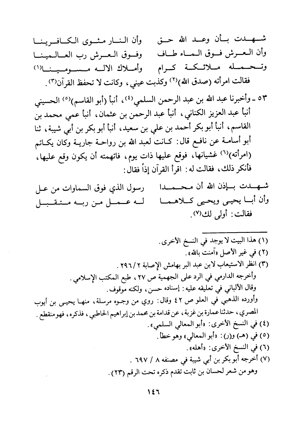 53- وَأْخَبَرَنَا عَبْدُ اللَّهِ بْنُ عَبْدِ الرَّحْمَنِ السُّلَمِيُّ (¬4) ، أَنْبَا (أَبُو الْقَاسِمِ) (¬5) الْحُسَيْنِيُّ، أَنْبَأَ عَبْدُ الْعَزِيزِ الْكِنَانِيُّ، أَنْبَأَ عَبْدُ الرَّحْمَنِ بْنُ عُثْمَانَ، أَنْبَأَ عَمِّي مُحَمَّدُ بْنُ الْقَاسِمِ، أَنْبَأَ أَبُو بَكْرٍ أَحْمَدُ بْنُ عَلِيِّ بْنِ سَعِيدٍ، أَنْبَأَ أَبُو بَكْرِ بْنُ أَبِي شَيْبَةَ، ثَنَا أَبُو أُسَامَةَ، عَنْ نَافِعٍ، قَالَ: كَانَتْ لِعَبْدِ اللَّهِ بْنِ رَوَاحَةَ جَارِيَةٌ، وَكَانَ يُكَاتِمُ (امْرَأَتَهُ) (¬6) غَشَيَانَهَا، فَوَقَعَ عَلَيْهَا ذَاتَ يَوْمٍ، فَاتَّهَمَتْهُ أَنْ يَكُونَ وَقَعَ عَلَيْهَا، فَأَنْكَرَ ذَلِكَ، فَقَالَتْ لَهُ: اقرأ القرآن إذاً، فَقَالَ: