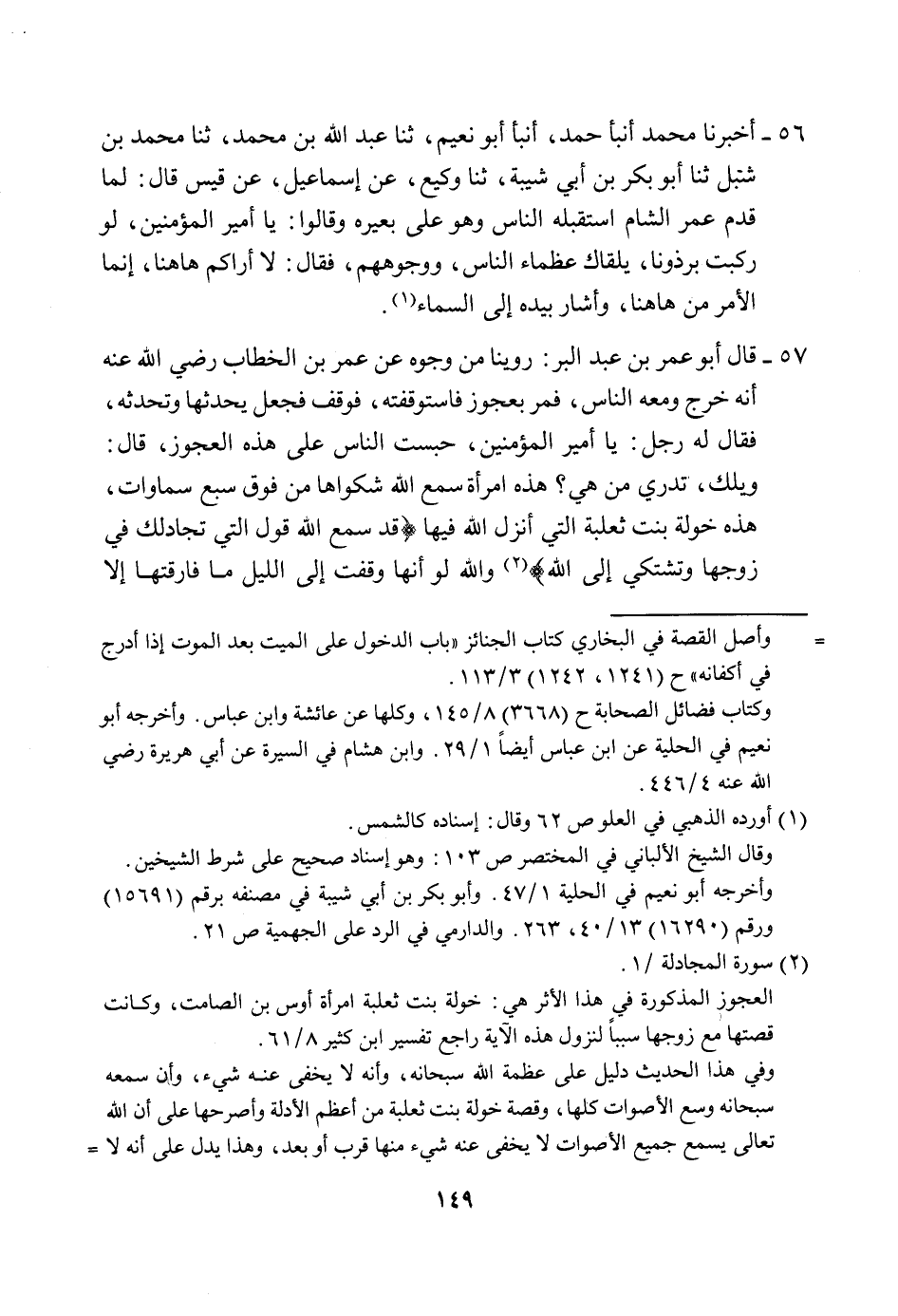 ورواه البخاري في صحيحه تعليقا، انظر: كتاب التوحيد، باب "وكان الله سميعا بصيرا"، 13/372. فالله تعالى في السماء، وخولة في الأرض في ناحية من نواحي منزل رسول الله صَلَّى اللَّهُ عَلَيْهِ وَسَلَّمَ تساره بقصتها، وعائشة قريبة منهما لا تسمع ما يقولان، والله سبحانه فوق سمواته وسمع قولها وفرج كربتها، وهذا من كمال الخالق وعظمته، وعجز المخلوق وافتقاره، فسبحان الله كيف عميت أعين الجهمية عن مثل هذه الأدلة الصارخة، بل كيف تجرأوا على التلاعب بها، وتحريفها عن موردها الذي أراد الله تعالى منها؟!