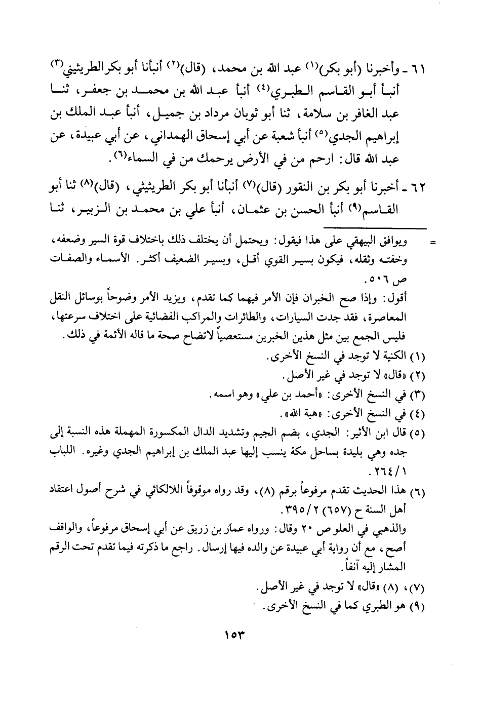 (¬6) هذا الحديث تقدم مرفوعا، برقم: (8) ، وقد رواه موقوفا اللالكائي في شرح أصول اعتقاد أهل السنة، ح (657) ، 2/395. والذهبي في العلو ص 20، وقال: ورواه عمار بن زريق عن أبي إسحاق مرفوعا، والواقف أصح، مع أن رواية أبي عبيدة عن والده فيها إرسال. راجع ما ذكرته فيما تقدم تحت الرقم المشار إليه آنفا.