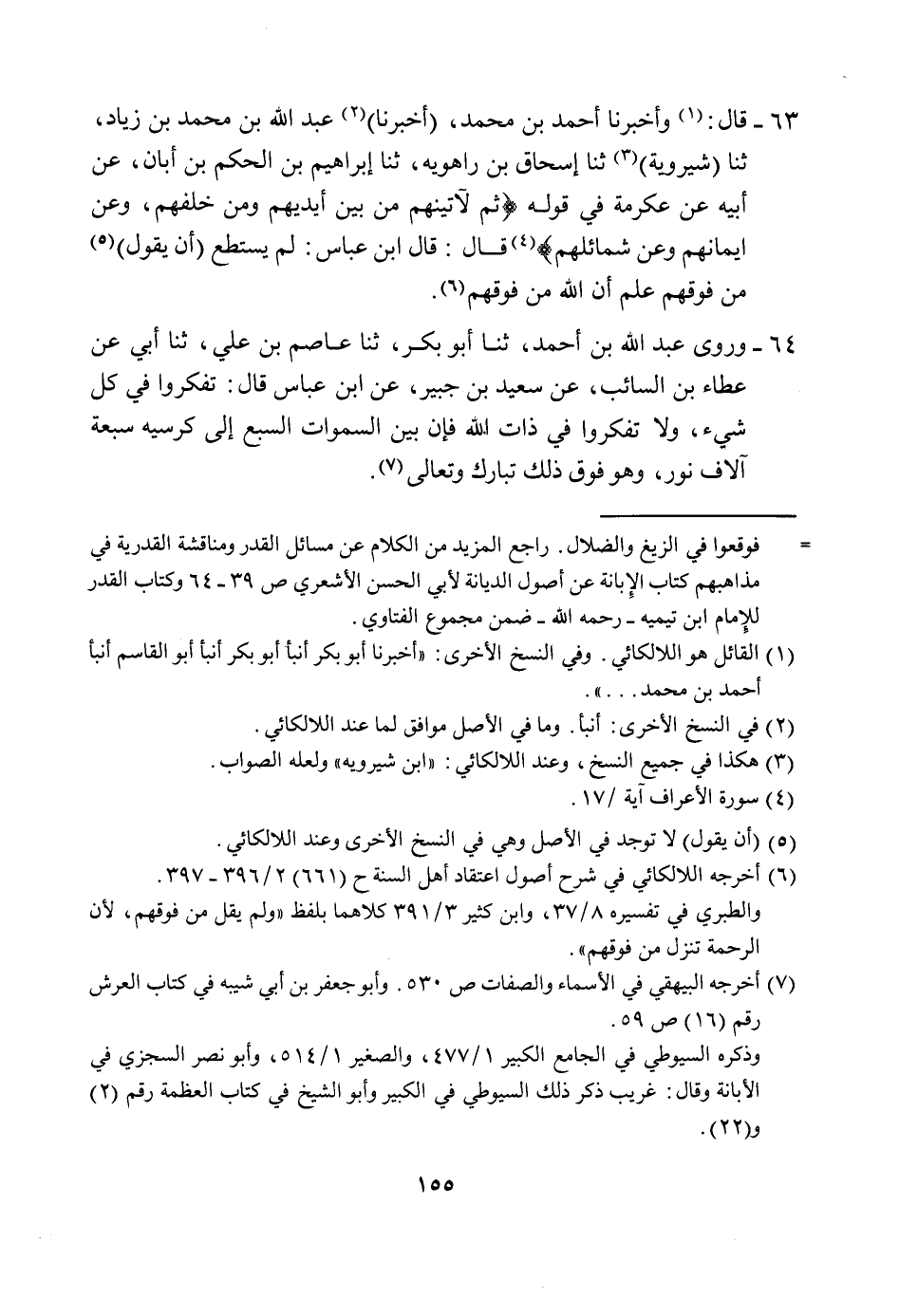 (¬7) أخرجه البيهقي في الأسماء والصفات ص 530، وأبو جعفر بن أبي شيبة في كتاب العرش، رقم: (16) ، ص 59.