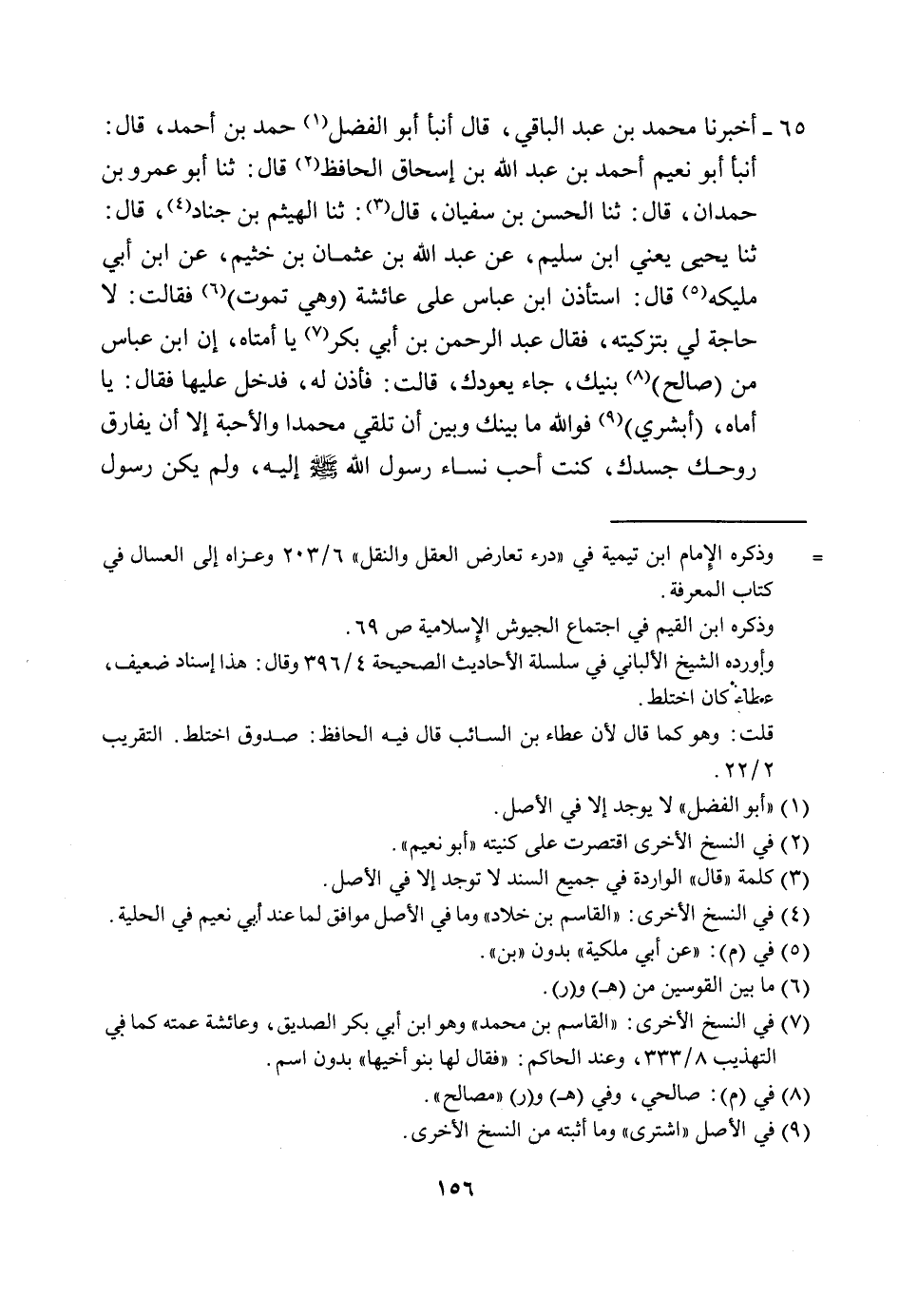 65- أَخْبَرَنَا مُحَمَّدُ بْنُ عَبْدِ الْبَاقِي، قَالَ أَنْبَأَ أَبُو الْفَضْلِ (¬1) حَمَدُ بْنُ أَحْمَدَ، قَالَ: أَنْبَأَ أَبُو نُعَيْمٍ أَحْمَدُ بْنُ عَبْدِ اللَّهِ بْنِ إِسْحَاقَ الْحَافِظُ (¬2) ، قَالَ: ثَنَا أَبُو عَمْرِو بْنُ حَمْدَانَ، قال: ثنا الحسن بن سُفْيَانُ، قَالَ (¬3) : ثَنَا الْهَيْثَمُ بْنُ جُنَادٍ (¬4) ، قَالَ: ثَنَا يَحْيَى، يَعْنِي ابْنَ سُلَيْمٍ، عَنْ عَبْدِ اللَّهِ بْنِ عُثْمَانَ بْنِ خُثَيْمٍ، عَنِ ابْنِ أَبِي مُلَيْكَةَ (¬5) ، قَالَ: اسْتَأْذَنَ ابْنُ عَبَّاسٍ عَلَى عَائِشَةَ (وَهِيَ تَمُوتُ) (¬6) ، فَقَالَتْ: لَا حَاجَةَ لِي بِتَزْكِيَتِهِ، فَقَالَ عَبْدُ الرَّحْمَنِ بن أَبِي بَكْرٍ (¬7) يَا أُمَّتَاهُ، إِنَّ ابْنَ عَبَّاسٍ مِنْ (صَالِحِ) (¬8) بَنِيكِ، جَاءَ يَعُودُكِ، قَالَتْ: فَأْذَنْ لَهُ، فَدَخَلَ عَلَيْهَا فَقَالَ: يَا أُمَّاهُ، (أَبْشِرِي) (¬9) فَوَاللَّهِ مَا بَيْنَكِ وَبَيْنَ أَنْ تَلْقَيْ مُحَمَّدًا وَالأَحِبَّةَ إِلَّا أَنْ يُفَارِقَ رُوحُكِ جَسَدَكِ، كُنْتِ أَحَبَّ نِسَاءِ رَسُولِ اللَّهِ صَلَّى اللَّهُ عَلَيْهِ وَسَلَّمَ إِلَيْهِ، وَلَمْ يَكُنْ رَسُولُ