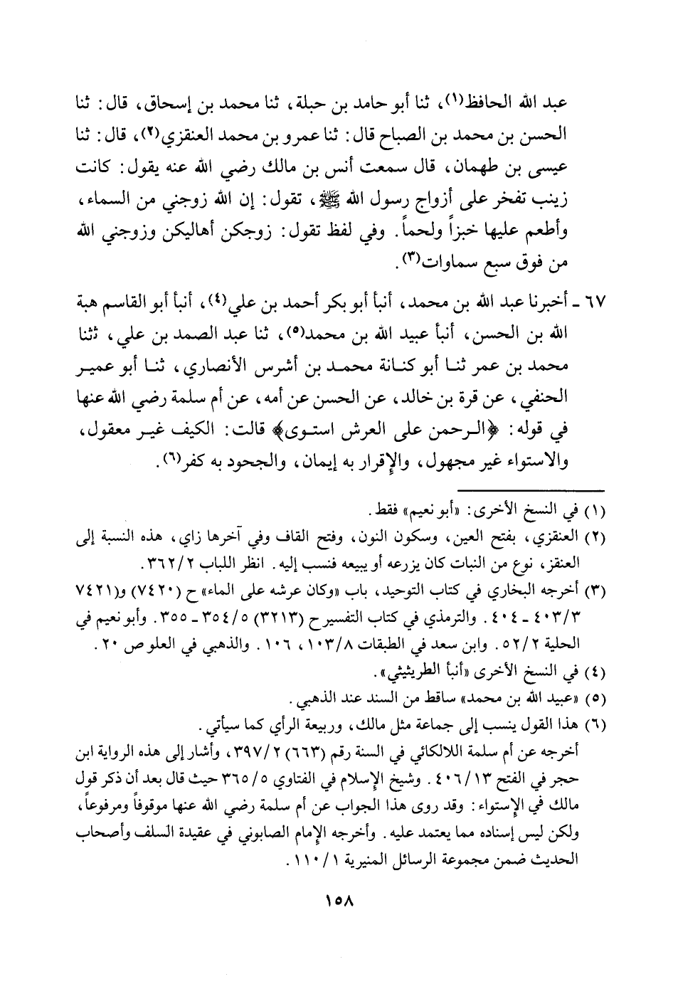 67- أَخْبَرَنَا عَبْدُ اللَّهِ بْنُ مُحَمَّدٍ، أَنْبَأَ أَبُو بَكْرٍ أَحْمَدُ بْنُ عَلِيٍّ (¬4) ، أَنْبَأَ أَبُو الْقَاسِمِ هِبَةُ اللَّهِ بْنُ الْحَسَنِ، أَنْبَأَ عُبَيْدُ اللَّهِ بْنُ مُحَمَّدٍ (¬5) ، ثَنَا عَبْدُ الصَّمَدِ بْنُ عَلِيٍّ، ثَنَا مُحَمَّدُ بْنُ عُمَرَ، ثَنَا أَبُو كِنَانَةَ مُحَمَّدُ بْنُ أَشْرَسَ الأَنْصَارِيُّ، ثَنَا أَبُو عُمَيْرٍ الْحَنَفِيُّ، عَنْ قُرَّةَ بْنِ خَالِدٍ، عَنِ الْحَسَنِ عَنْ أُمِّهِ، عَنْ أُمِّ سَلَمَةَ رَضِيَ اللَّهُ عَنْهَا، فِي قَوْلِهِ: {الرَّحْمَنُ عَلَى الْعَرْشِ اسْتَوَى} ، قَالَتْ: الْكَيْفُ غَيْرُ مَعْقُولٍ، وَالاسْتِوَاءُ غَيْرُ مَجْهُولٍ، وَالإِقْرَارُ بِهِ إِيَمَانٌ، وَالْجُحُودُ بِهِ كُفْرٌ (¬6) .