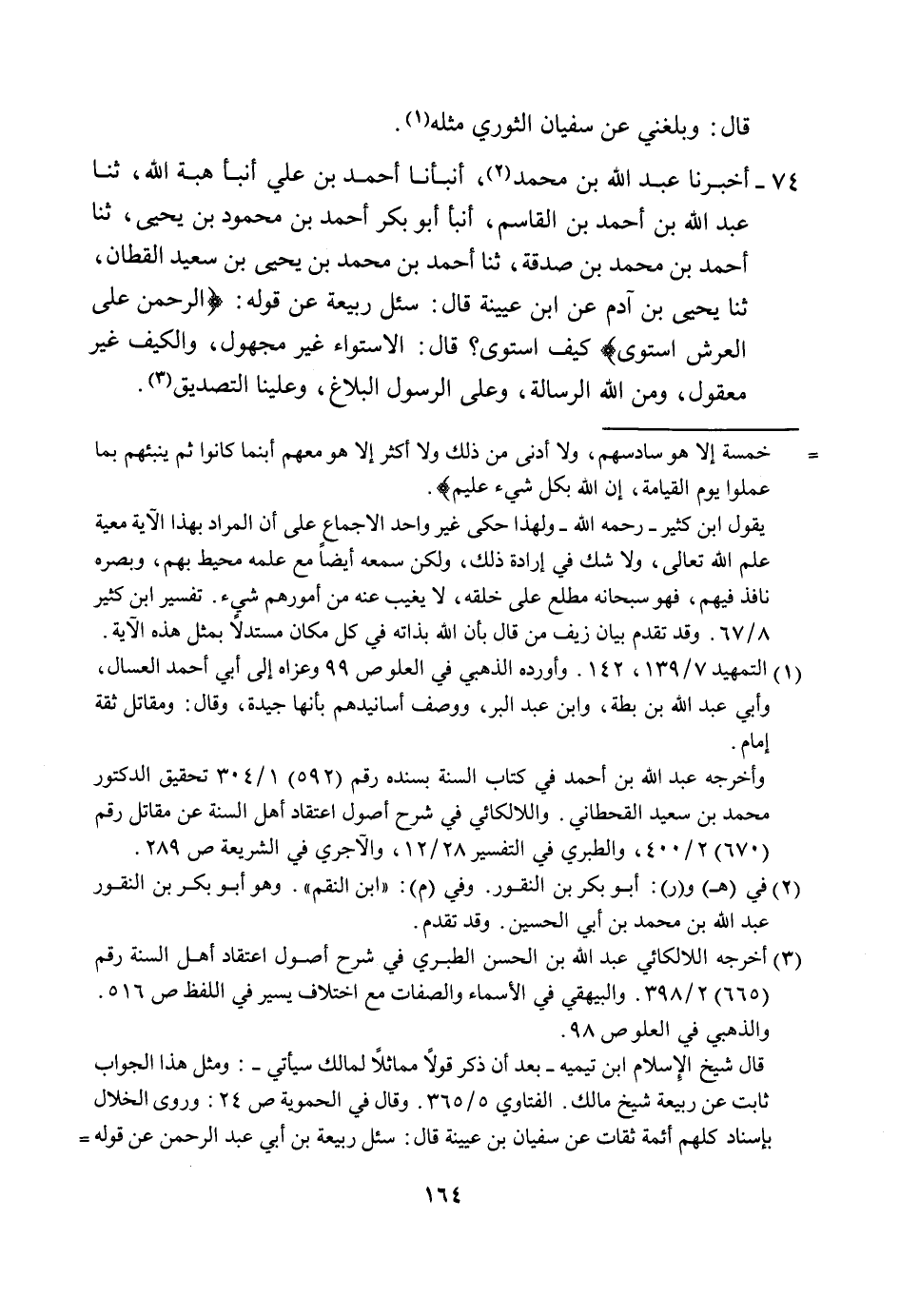 74- أَخْبَرَنَا عَبْدُ الله بن حميد (¬2) ، أَنْبَأَنَا أَحْمَدُ بْنُ عَلِيٍّ، أَنْبَا هِبَةُ اللَّهِ، ثَنَا عَبْدُ اللَّهِ بْنُ أَحْمَدَ بْنِ الْقَاسِمِ، أَنْبَأَ أَبُو بَكْرٍ أَحْمَدُ بْنُ مَحْمُودِ بْنِ يَحْيَى، ثَنَا أَحْمَدُ بْنُ مُحَمَّدِ بْنِ صَدَقَةَ، ثَنَا أَحْمَدَ بْنُ مُحَمَّدِ بْنِ يَحْيَى بْنِ سَعِيدٍ الْقَطَّانُ، ثَنَا يَحْيَى بْنُ آدَمَ عَنِ ابْنِ عُيَيْنَةَ، قَالَ: سُئِلَ رَبِيعَةُ عَنْ قَوْلِهِ: {الرَّحْمَنُ عَلَى الْعَرْشِ اسْتَوَى} كَيْفَ اسْتَوَى؟ قَالَ: الاسْتِوَاءُ غَيْرُ مَجْهُولٍ، وَالْكَيْفُ غَيْرُ مَعْقُولٍ، ومن الله الرسال، وَعَلَى الرَّسُولِ الْبَلَاغُ، وَعَلَيْنَا التَّصْدِيقُ (¬3) .