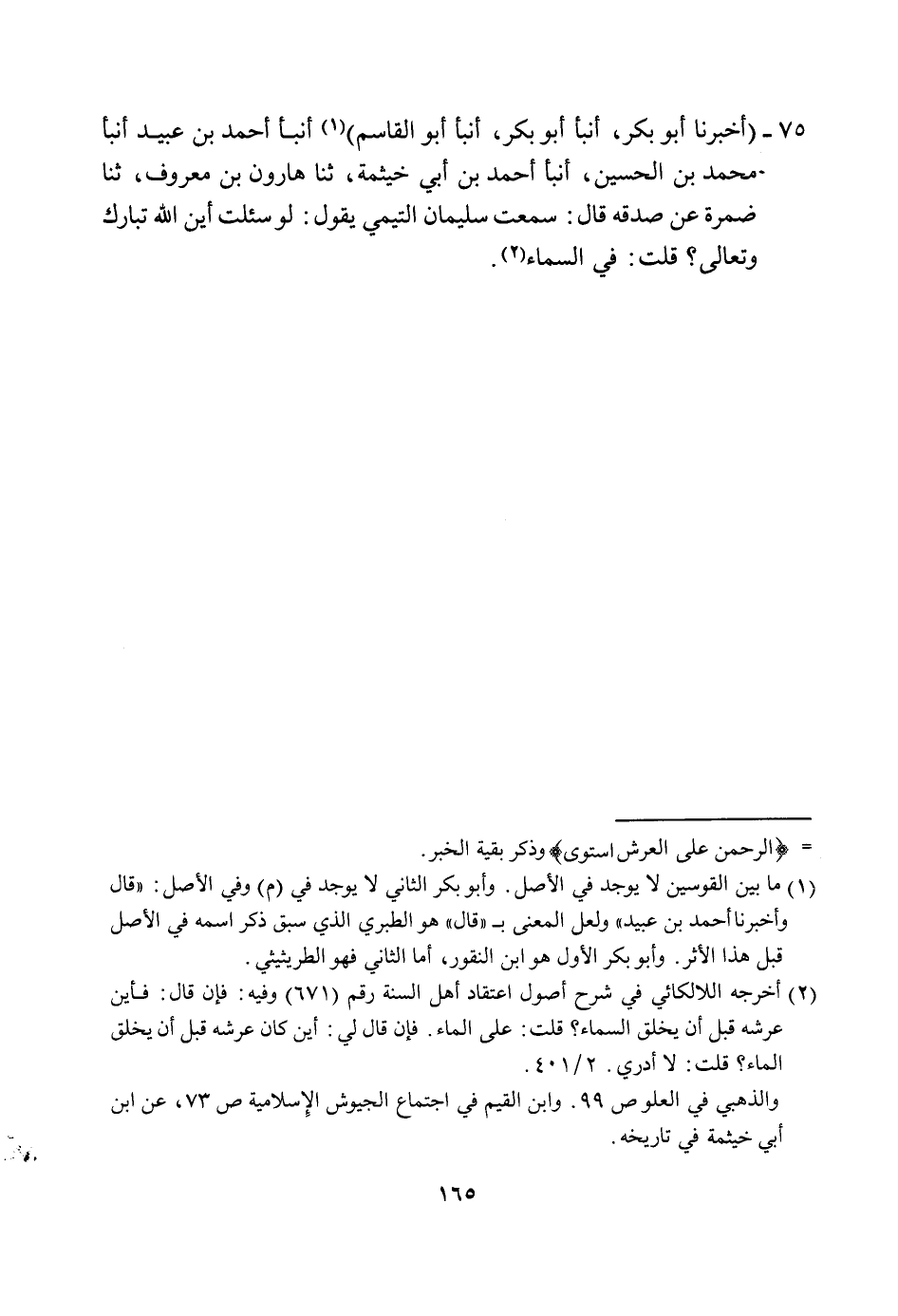 (¬2) أخرجه اللالكائي في شرح أصول اعتقاد أهل السنة، رقم: (671) ، وفيه: فإن قال: فأين عرشه قبل أن يخلق السماء؟ قلت: على الماء. فإن قال لي: أن كان عرشه قبل أن يخلق الماء؟ قلت: لا أدري. 2/401.