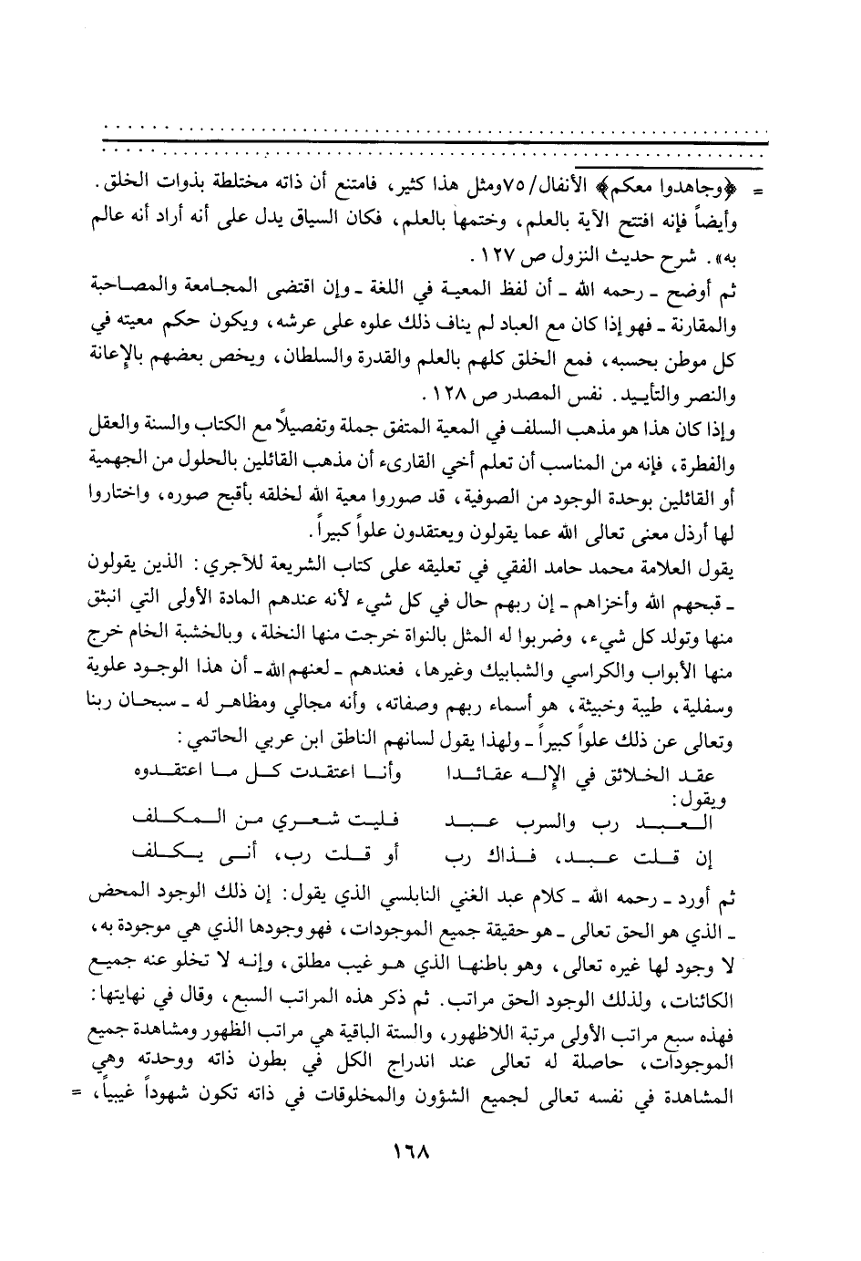 ثم أورد -رحمه الله- كلام عبد الغني النابلسي الذي يقول: إن ذلك الوجود المحض -الذي هو الحق تعالى- هو حقيقة جميع الموجودات، فهو وجودها الذي هي موجودة به، لا وجود لها غيره تعالى، وهو باطنها الذي هو غيب مطلق، وإنه لا تخلو عنه جميع الكائنات، ولذلك الوجود الحق مراتب. ثم ذكر هذه المراتب السبع، وقال في نهايتها: فذه سبع مراتب، الأولى: مرتبة اللاظهور، والستة الباقية هي مراتب الظهور ومشاهدة جميع الموجودات، حاصلة له تعالى عند اندراج الكل في بطون ذاته ووجدته، وهي المشاهدة في نفسه تعالى لجميع الشؤون والمخلوقات في ذاته تكون شهودا غيبيا،