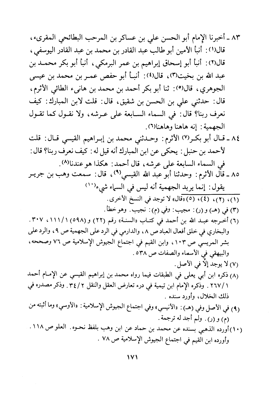 83- أَخْبَرَنَا الإِمَامُ أَبُو الْحَسَنِ عَلِيُّ بْنُ عَسَاكِرِ بْنِ الْمُرَحِّبِ الْبَطَائِحِيُّ الْمُقْرِئ، قَالَ (¬1) : أَنْبَأَ الأَمِينُ أَبُو طَالِبٍ عَبْدُ الْقَادِرِ بْنُ مُحَمَّدِ بْنِ عَبْدِ الْقَادِرِ الْيُوسُفِيُّ، قَالَ (¬2) : أَنْبَأَ أَبُو إِسْحَاقَ إِبْرَاهِيمُ بْنُ عُمَرَ الْبَرْمَكِيُّ، أَنَبَأَ أَبُو بَكْرٍ مُحَمَّدُ بْنُ عَبْدِ اللَّهِ بْنِ بَخِيتٍ (¬3) ، قَالَ (¬4) : أَنْبَأَ أَبِو حَفْصٍ عُمَرُ بْنُ مُحَمَّدِ بْنِ عِيسَى الْجَوْهَرِيُّ، قَالَ (¬5) : ثَنَا أَبُو بَكْرٍ أَحْمَدُ بْنُ مُحَمَّدِ بْنِ هَانِئٍ الطَّائِيُّ الأَثْرَمُ، قَالَ: حَدَّثَنِي عَلِيُّ بْنُ الْحَسَنِ بْنِ شَقِيقٍ، قَالَ: قُلْتُ لِابْنِ الْمُبَارَكِ: كَيْفَ نَعْرِفُ رَبَّنَا؟ قَالَ: فِي السَّمَاءِ السَّابِعَةِ عَلَى عَرْشِهِ، وَلَا نَقُولُ كَمَا تَقُولُ الْجَهْمِيَّةُ: إِنَّهُ هَاهُنَا وَهَاهُنَا (¬6) .