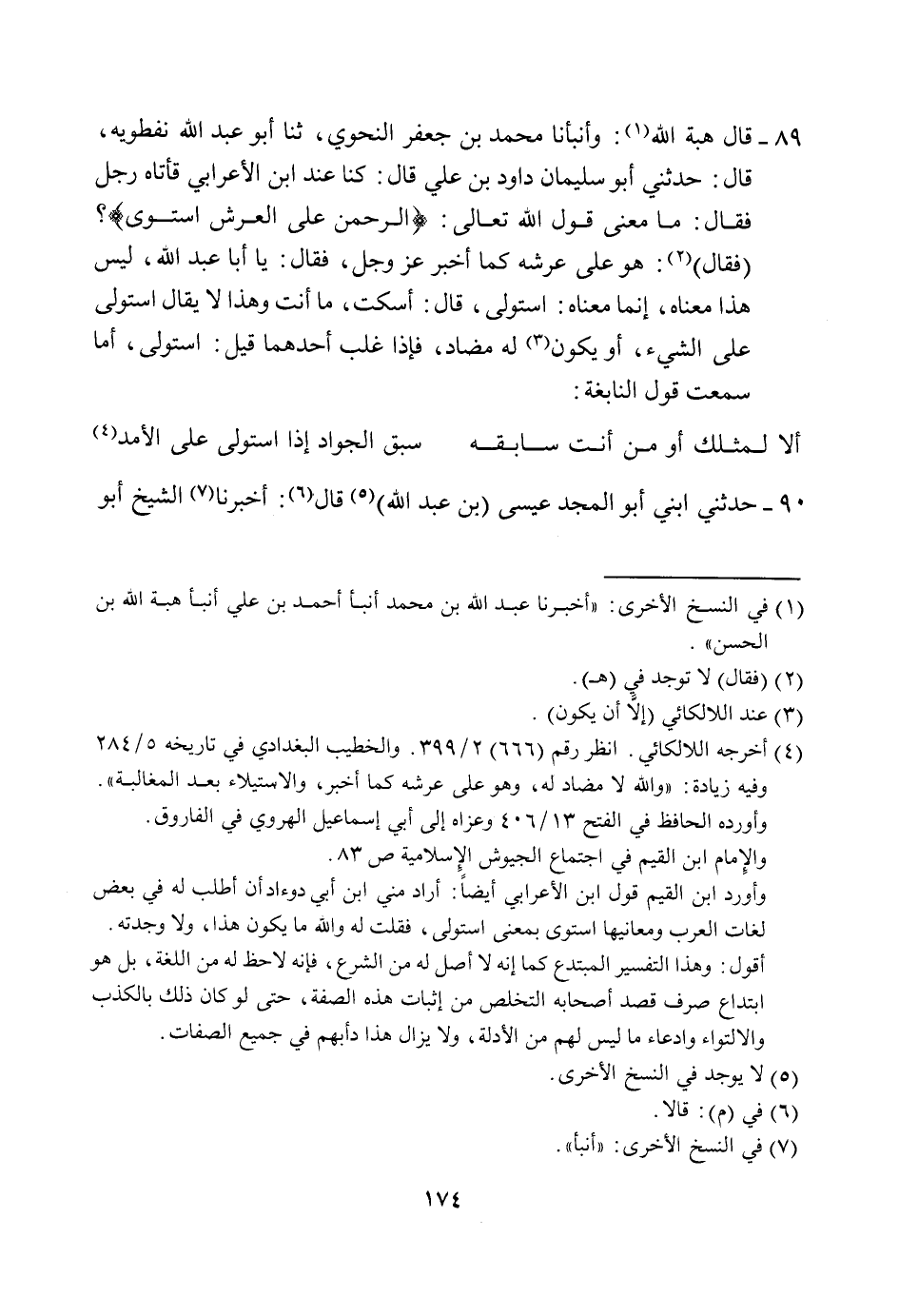 89- قَالَ هِبَةُ اللَّهِ (¬1) : وَأَنْبَأَنَا مُحَمَّدُ بْنُ جَعْفَرٍ النَّحْوِيُّ، ثَنَا أَبُو عَبْدِ اللَّهِ نِفْطَوَيْهِ، قَالَ: حَدَّثَنِي أَبُو سُلَيْمَانَ دَاوُدُ بْنُ عَلِيٍّ، قَالَ: كُنَّا عِنْدَ ابْنِ الأَعْرَابِيِّ فَأَتَاهُ رَجُلٌ، فَقَالَ: مَا مَعْنَى قَوْلِ اللَّهِ تَعَالَى: {الرَّحْمَنُ عَلَى الْعَرْشِ اسْتَوَى} ؟ (فَقَالَ) (¬2) : هُوَ عَلَى عَرْشِهِ كَمَا أَخْبَرَ عَزَّ وَجَلَّ، فَقَالَ: يَا أَبَا عَبْدِ اللَّهِ، لَيْسَ هَذَا مَعْنَاهُ، إِنَّمَا مَعْنَاهُ: اسْتَوْلَى، قَالَ: اسْكُتْ، مَا أَنْتَ وَهَذَا لَا يُقَالُ اسْتَوْلَى عَلَى الشَّيْءِ، أَوْ يَكُونُ (¬3) لَهُ مُضَادٌّ، فَإِذَا غَلَبَ أَحَدُهُمَا قِيلَ: اسْتَوْلَى، أَمَا سَمِعْتَ قَوْلَ النَّابِغَةِ: