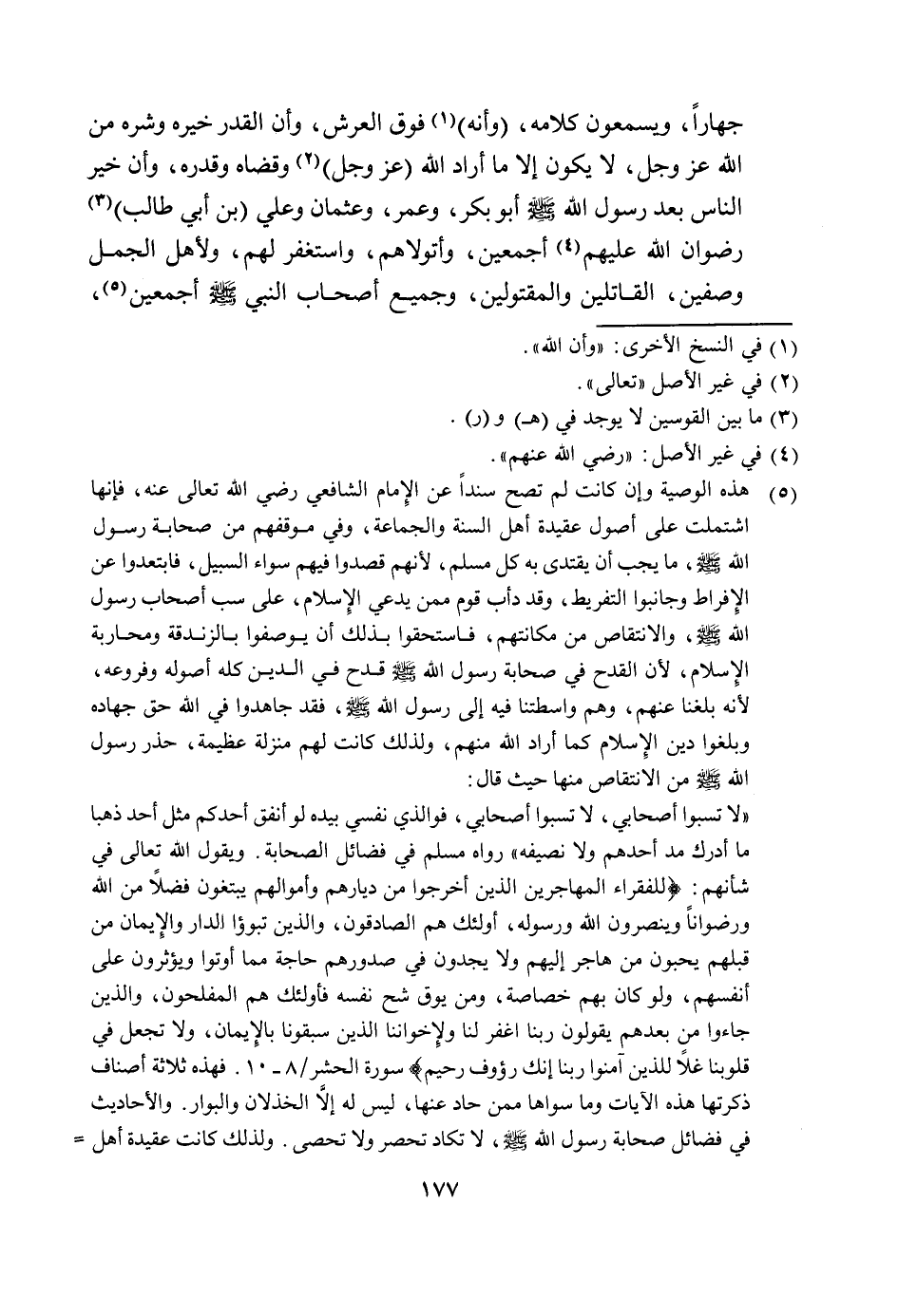 (¬5) هذه الوصية وإن كانت لم تصح سندا عن الإمام الشافعي رضي الله تعالى عنه، فإنها اشتملت على أصول عقيدة أهل السنة والجماعة، وفي موفقهم من صحابة رسول الله صَلَّى اللَّهُ عَلَيْهِ وَسَلَّمَ، ما يجب أن يقتدي به كل مسلم، لأنهم قصدوا فيهم سواء السبيل، فابتعدوا عن الإفراط وجانبوا التفريط، وقد دأب قوم ممن يدعي الإسلام، على سب أصحاب رسول الله صَلَّى اللَّهُ عَلَيْهِ وَسَلَّمَ، والانتقاص من مكانتهم، فاستحقوا بذلك أن يوصفوا بالزندقة ومحاربة الإسلام، لأن القدح في صحابة رسول الله صَلَّى اللَّهُ عَلَيْهِ وَسَلَّمَ قدح في الدين كله أصوله وفروعه، لأنه بلغنا عنهم، وهم واسطتنا فيه إلى رسول الله صَلَّى اللَّهُ عَلَيْهِ وَسَلَّمَ، فقد جاهدوا في الله حق حق جهاده وبلغوا دين الإسلام كما أراد الله منهم، ولذلك كانت لهم منزلة عظيمة، حذر رسول الله صَلَّى اللَّهُ عَلَيْهِ وَسَلَّمَ من الانتقاص منها حيث قال: