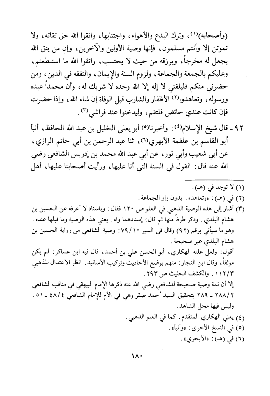 (¬3) أشار إلى هذه الوصية الذهبي في العلو ص 120، فقال: وبإسناد لا أعرفه عن الحسين بن هشام البلدي. وذكر طرفا منها ثم قال: إسنادهما واه. يعني هذه الوصية وما قبلها عنده. وهو ما سيأتي برقم: (92) ، وقال في السير 10/79: وصية الشافعي من رواية الحسين بن هشام البلدي غير صحيحه.