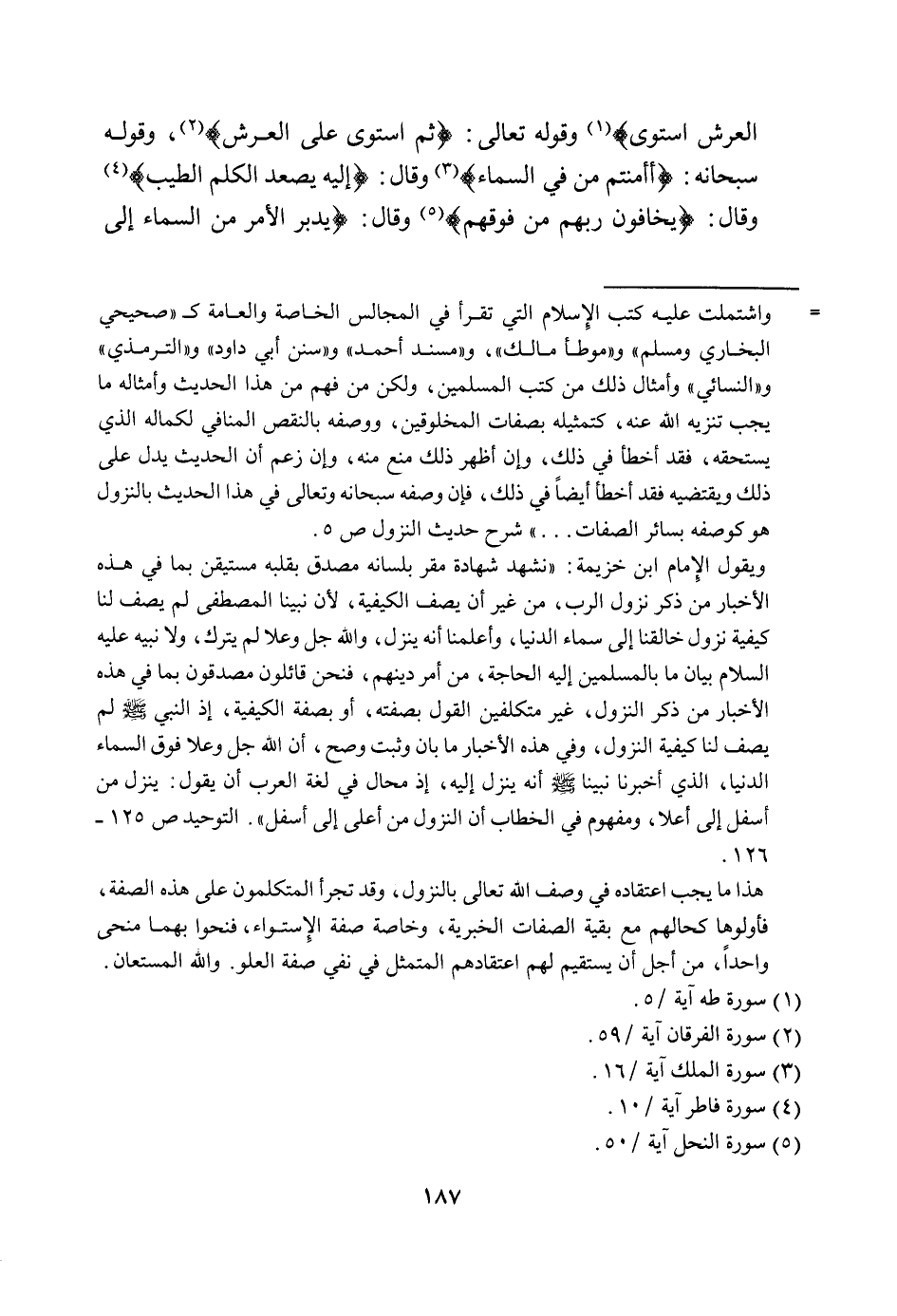 هذا الكلام وأمثاله علانية، وبلغه الأمة تبليغا عاما لم يخص به أحدا دون أحد، ولا كتمه عن أحد، وكان الصحابة والتابعون تذكره، وتأثره، وتبلغه في المجالس الخاصة والعامة، واشتملت عليه كتب الإسلام التي تقرأ في المجالس الخاصة والعامة، كصحيحي البخاري ومسلم، وموطأ مالك، ومسند أحمد، وسنن أبي داود، والترمذي، والنسائي، وأمثال ذلك من كتب المسلمين، ولكن من فهم من هذا الحديث وأمثاله ما يجب تنزيه الله عنه، كتمثيله بصفات المخلوقين، ووصفه بالنقص المنافي لكماله الذي يستحقه، فقد أخطأ في ذلك، وإن أظهر ذلك منع منه، وإن زعم أن الحديث يدل على ذلك ويقتضيه فقد أخطأ أيضا في ذلك فإن وصفه سبحانه وتعالى في هذا الحديث بالنزول هو كوصفه بسائر الصفات ... ". شرح حديث النزول ص5.