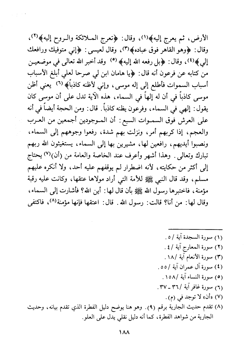 (¬8) تقدم حديث الجارية برقم: (9) . وهو هنا دليل الفطرة الذي تقدم بيانه، وحديث الجارية من شواهد الفطرة، كما أنه دليل نقلي يدل على العلو.