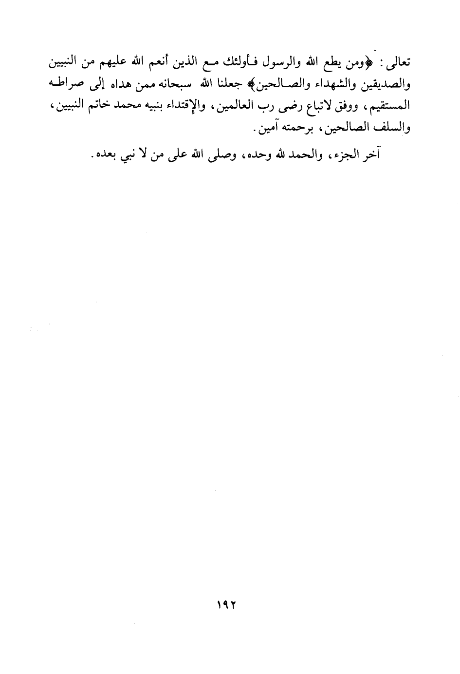 تعالى: {وَمَنْ يُطِعِ اللَّهَ وَالرَّسُولَ فَأُولَئِكَ مَعَ الَّذِينَ أَنْعَمَ اللَّهُ عَلَيْهِمْ مِنَ النَّبِيِّينَ وَالصِّدِّيقِينَ وَالشُّهَدَاءِ وَالصَّالِحِين} (¬1) ، جعلنا الله سبحانه ممن هداه إلى صراطه المستقيم، ووفق لاتباع رضى رب العالمين، والاقتداء بنبيه محمد خاتم النبيين، والسلف الصالحين، برحمته آمين.