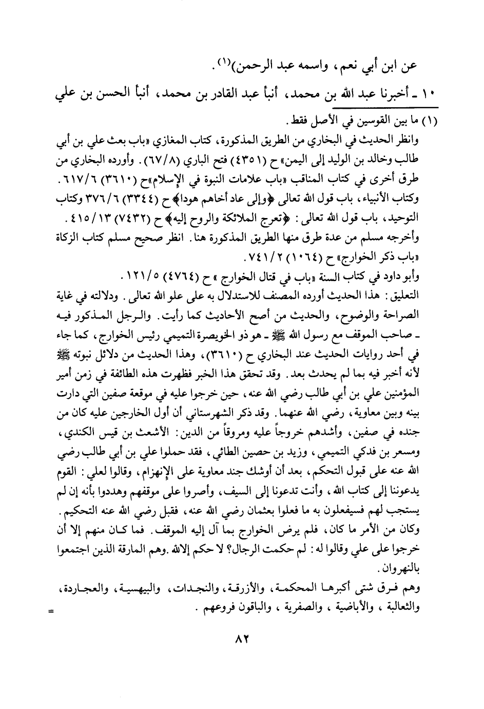 التعليق: هذا الحديث أورده المصنف للاستدلال به على علو الله تعالى. ودلالته في غاية الصراحة والوضوح، والحديث من أصح الأحاديث كما رأيت. والرجل المذكور فيه -صاحب الموقف مع رسول الله صَلَّى اللَّهُ عَلَيْهِ وَسَلَّمَ- هو ذو الخويصرة التميمي رئيس الخوارج، كما جاء في أحد روايات الحديث عند البخاري، ح (3610) ، وهذا الحديث من دلائل نبوته صَلَّى اللَّهُ عَلَيْهِ وَسَلَّمَ، لأنه أخبر فيه بما لم يحدث بعد. وقد تحقق هذا الخبر فظهرت هذه الطائفة في زمن أمير المؤمنين علي بن أبي طالب رضي الله عنه، حين خرجوا عليه في موقعة صفين التي دارت بينه وبين معاوية، رضي الله عنهما. وقد ذكر الشهرستاني أن أول الخارجين عليه كان من جنده في صفين، وأشدهم خروجا عليه ومروقا من الدين: الأشعث بن قيس الكندي، ومسعر بن فدكي التميمي، وزيد بن حصين الطائي، فقد حملوا علي بن أبي طالب رضي الله عنه على قبول التحكيم، بعد أن أوشك جند معاوية على الانهزام، وقالوا لعلي: القوم يدعوننا إلى كتاب الله، وأنت تدعونا إلى السيف، وأصروا على موقفهم وهددوا بأنه إن لم يستجب لهم فسيفعلون به ما فعلوا بعثمان رضي الله عنه، فقبل رضي الله عنه التحكيم. وكان من الأمر ما كان، فلم يرض الخوارج بما آل إليه الموقف. فما كان منهم إلا أن خرجوا على علي، وقالوا له: لم حكمت الرجال؟ لا حكم إلا لله، وهم المارقة الذين اجتمعوا بالنهروان.