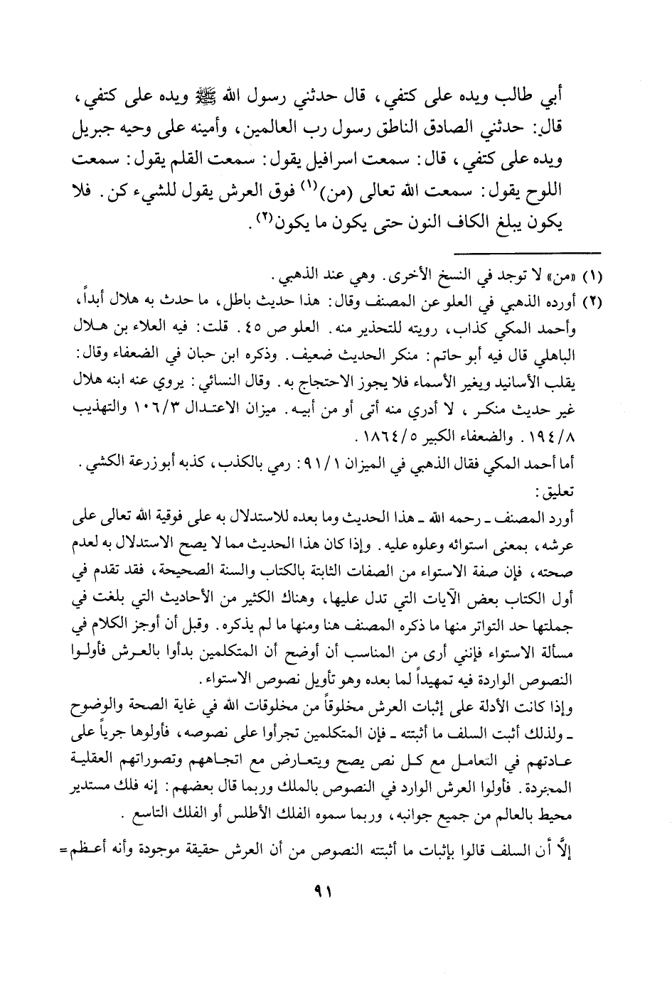 أورد المصنف -رحمه الله- هذا الحديث وما بعده للاستدلال به على فوقية الله تعالى على عرشه، بمعنى استوائه وعلوه عليه. وإذا كان هذا الحديث مما لا يصح الاستدلال به لعدم صحته، فإن صفة الاستواء من الصفات الثابتة بالكتاب والسنة الصحيحة، فقد تقدم في أول الكتاب بعض الآيات التي تدل عليها، وهناك الكثير من الأحاديث التي بلغت في جملتها حد التواتر منها ما ذكره المصنف هنا، ومنها ما لم يذكره. وقبل أن أوجز الكلام في مسألة الاستواء فإنني أرى من المناسب أن أوضح أن المتكلمين بدأوا بالعرش فأولوا النصوص الواردة فيه تمهيدا لما بعده، وهو تأويل نصوص الاستواء.