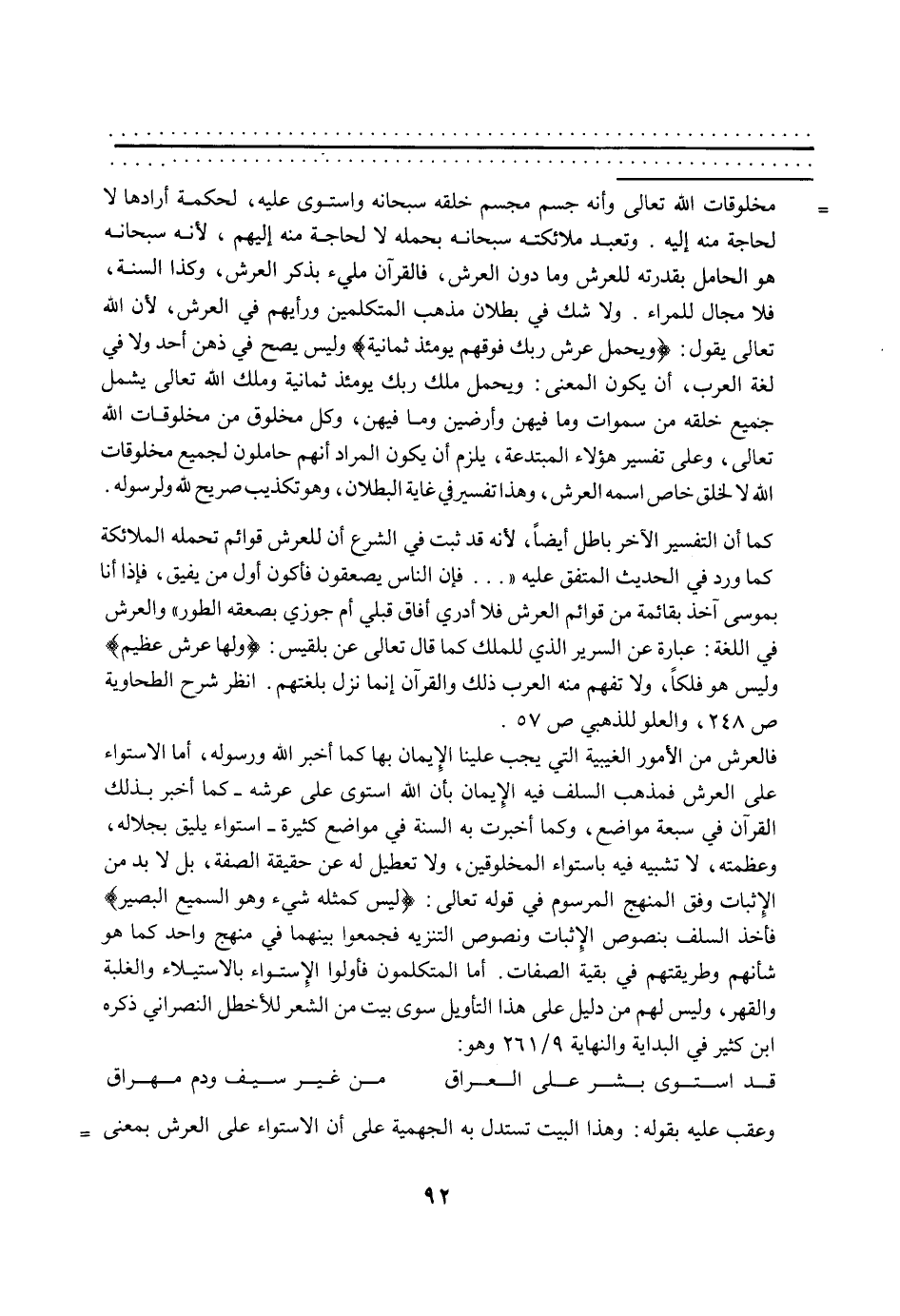 مخلوقات الله تعالى، وأنه جسم مجسم خلقه سبحانه، واستوى عليه، لحكمة أرادها لا لحاجة منه إليه. وتعبد ملائكته سبحانه بحمله لا لحاجة منه إليهم، لأنه سبحانه هو الحامل بقدرته للعرش وما دون العرش، فالقرآن مليء بذكر العرش، وكذا السنة، فلا مجال للمراء. ولا شك في بطلان مذهب المتكلمين ورأيهم في العرش، لأن الله تعالى يقول: {وَيَحْمِلُ عَرْشَ رَبِّكَ فَوْقَهُمْ يَوْمَئِذٍ ثَمَانِيَةٌ} (الحاقة: من الآية17) ، وليس يصح في ذهن أحد ولا في لغة العرب، أن يكون المعنى: ويحمل ملك ربك يومئذ ثمانية، وملك الله تعالى يشمل جميع خلقه من سموات وما فيهن، وأرضين وما فيهن، وكل مخلوق من مخلوقات الله تعالى، وعلى تفسير هؤلاء المبتدعة يلزم أن يكون المراد أنهم حاملون لجميع مخلوقات الله لا لخلق خاص اسمه العرش، وهذا تفسير في غاية البطلان، وهو تكذيب صريح لله ولرسوله.