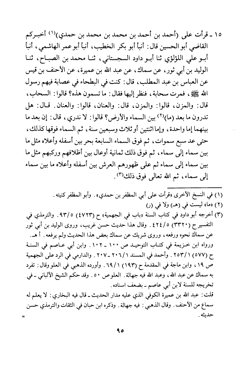 15- قَرَأْتُ عَلَى (أَحْمَدَ بْنِ أَحْمَدَ بْنِ مُحَمَّدِ بْنِ مُحَمَّدِ بْنِ حَمْدِيٍّ) (¬1) أَخْبَرَكُمُ الْقَاضِي أَبُو الْحُسَيْنِ، قَالَ: أَنْبَأَ أَبُو بَكْرٍ الْخَطِيبُ، أَنْبَأَ أَبُو عُمَرَ الْهَاشِمِيُّ، أَنْبَأَ أَبُو عَلِيٍّ اللؤلؤي، ثَنَا أَبُو دَاوُدَ السِّجِسْتَانِيُّ، ثَنَا مُحَمَّدُ بْنُ الصَّبَّاحِ، ثَنَا الْوَلِيدُ بْنُ أَبِي ثَوْرٍ، عَنْ سِمَاكٍ، عَنْ عَبْدِ اللَّهِ بْنِ عُمَيْرَةَ، عَنِ الأَحْنَفِ بْنِ قَيْسٍ عَنِ الْعَبَّاسِ بْنِ عَبْدِ الْمُطَّلِبِ، قَالَ: كُنْتُ فِي الْبَطْحَاءِ فِي عِصَابَةٍ فيهم رَسُولُ اللَّهِ صَلَّى اللَّهُ عَلَيْهِ وَسَلَّمَ، فَمَرَّتْ سَحَابَةٌ، فَنَظَرَ إِلَيْهَا فَقَالَ: مَا تُسَمُّونَ هَذِهِ؟ قَالُوا: السَّحَابُ، قَالَ: وَالْمُزْنُ، قَالُوا: وَالْمُزْنُ، قَالَ: وَالْعَنَانُ، قَالُوا: وَالْعَنَانُ. قَالَ: هَلْ تَدْرُونَ مَا بُعْدُ (مَا) (¬2) بَيْنَ السَّمَاءِ وَالأَرْضِ؟ قَالُوا لَا نَدْرِي، قَالَ: إِنَّ بُعْدَ مَا بَيْنَهُمَا إِمَّا وَاحِدَةٍ، وَإِمَّا اثْنَتَيْنِ أَوْ ثَلَاثٍ وَسَبَعْيِنَ سَنَةً، ثُمَّ السَّمَاءُ فَوْقَهَا كَذَلِكَ، حَتَّى عَدَّ سَبْعَ سَمَاوَاتٍ، ثُمَّ فَوْقَ السَّمَاءِ السَّابِعَةِ بَحْرٌ بَيْنَ أَسْفَلِهِ وَأَعْلَاهُ مِثْلُ مَا بَيْنَ سَمَاءٍ إِلَى سَمَاءٍ، ثُمَّ فَوْقَ ذَلِكَ ثَمَانِيَةُ أَوْعَالٍ بَيْنَ أَظْلَافِهِمْ وَرُكَبِهِمْ مِثْلُ مَا بَيْنَ سَمَاءٍ إِلَى سَمَاءٍ، ثُمَّ عَلَى ظُهُورِهِمُ الْعَرْشُ بَيْنَ أَسْفَلِهِ وَأَعْلَاهُ مَا بَيْنَ سَمَاءٍ إِلَى سَمَاءٍ، ثُمَّ اللَّهُ تَعَالَى فَوْقَ ذَلِكَ (¬3) .