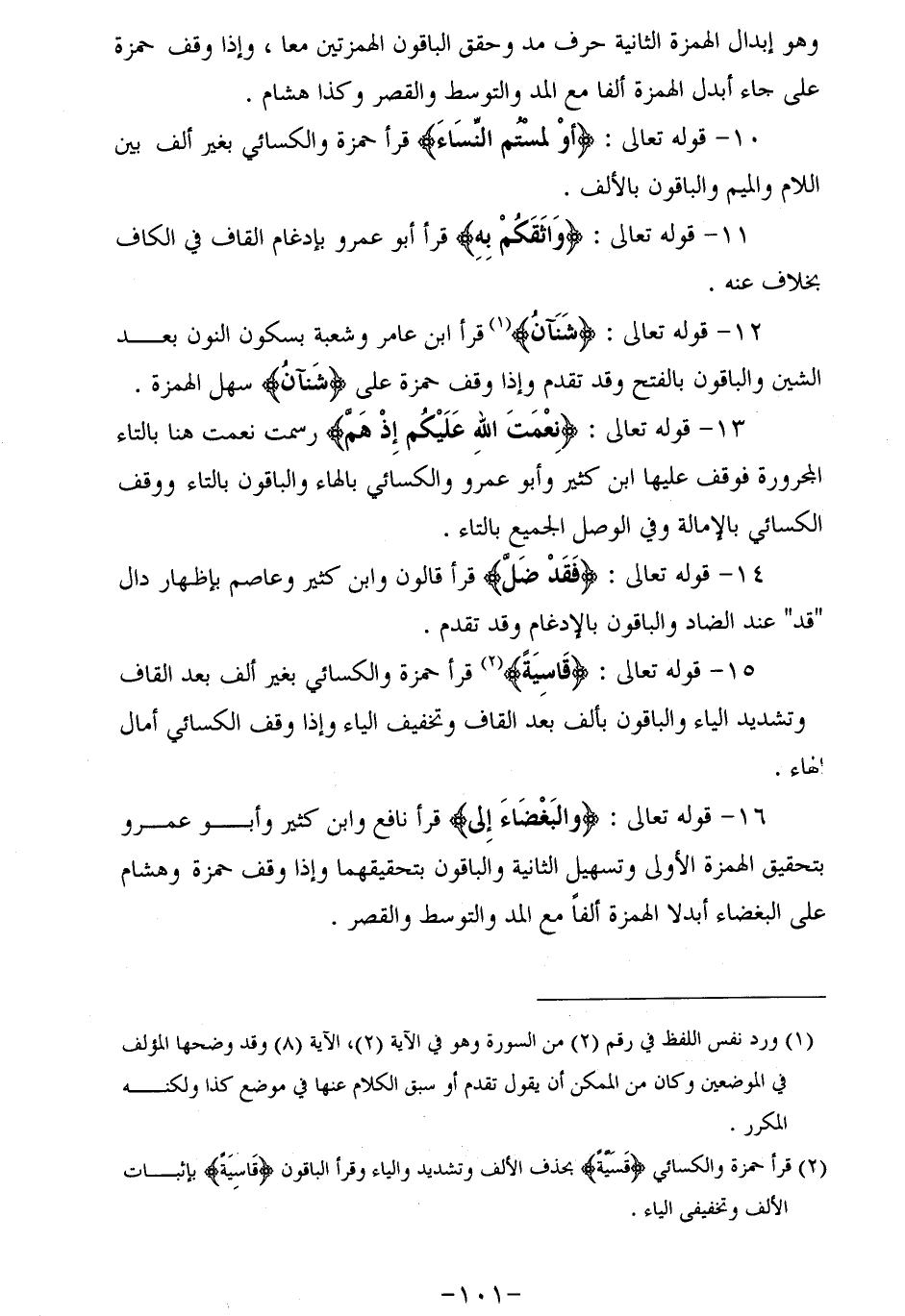 16 - قوله تعالى: وَالْبَغْضاءَ إِلى قرأ نافع وابن كثير وأبو عمرو بتحقيق الهمزة الأولى وتسهيل الثانية والباقون بتحقيقهما وإذا وقف حمزة وهشام على البغضاء أبدلا الهمزة ألفا مع المد والتوسط والقصر.