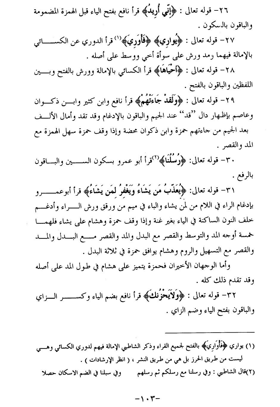 (¬1) يواري فَأُوارِيَ بالفتح لجميع القراء وذكر الشاطبي الإمالة فيهم لدوري الكسائي وهي ليست من طريق الحرز بل هي من طريق النشر، (انظر الإرشادات).