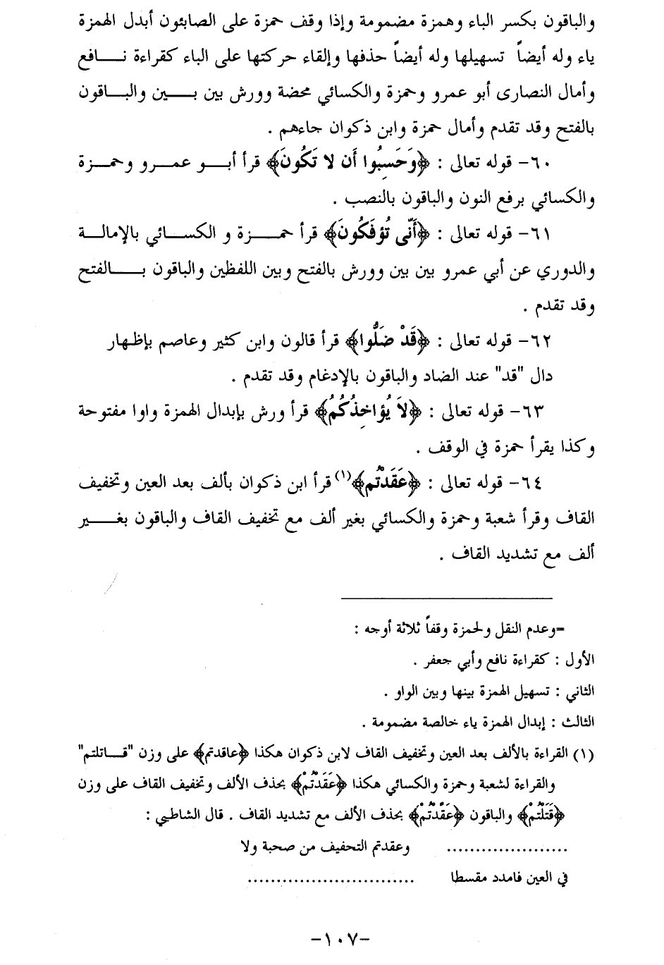 (¬1) القراءة بالألف بعد العين وتخفيف القاف لابن ذكوان هكذا (عاقدتم) على وزن" قاتلتم" والقراءة لشعبة وحمزة والكسائي هكذا عَقَّدْتُمُ بحذف الألف وتخفيف القاف على وزن (قتلتم) والباقون عَقَّدْتُمُ بحذف الألف مع تشديد القاف. قال الشاطبي: