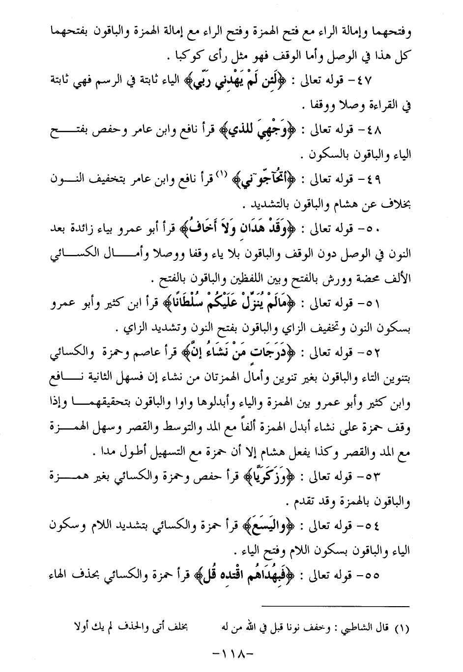 52 - قوله تعالى: دَرَجاتٍ مَنْ نَشاءُ إِنَّ قرأ عاصم وحمزة والكسائي بتنوين التاء والباقون بغير تنوين وأمال الهمزتان من نشاء إن فسهل الثانية نافع وابن كثير وأبو عمرو بين الهمزة والياء وأبدلوها واوا والباقون بتحقيقهما وإذا وقف حمزة على نشاء وأبدل الهمزة ألفا مع المد والتوسط والقصر وسهل الهمزة مع المد والقصر وكذا يفعل هشام إلا أن حمزة مع التسهيل أطول مدا.