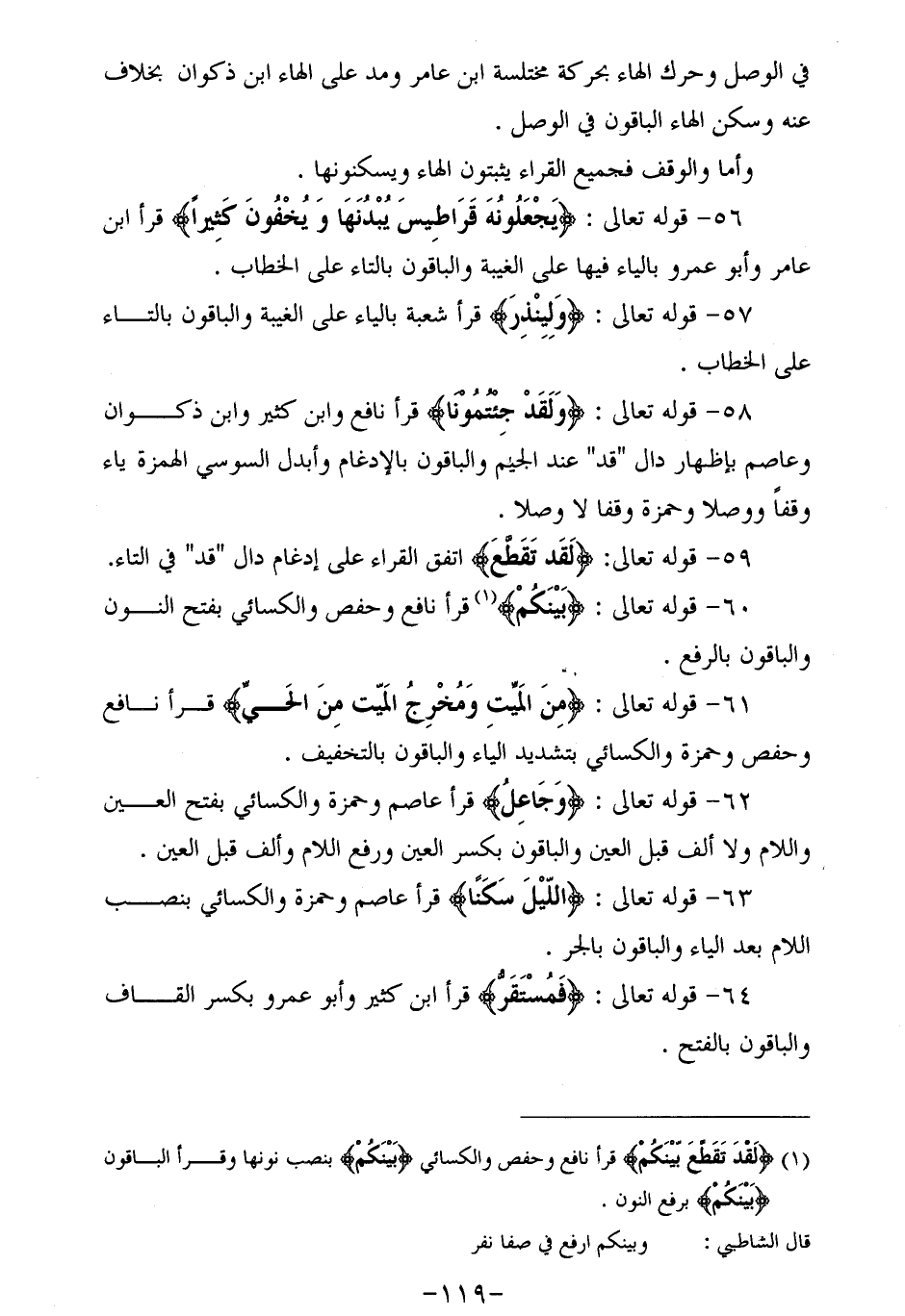 56 - قوله تعالى: (يجعلونه قراطيس يبدنها ويخفون كثيرا) قرأ ابن عامر وأبو عمرو بالياء فيها على الغيبة والباقون بالتاء على الخطاب.