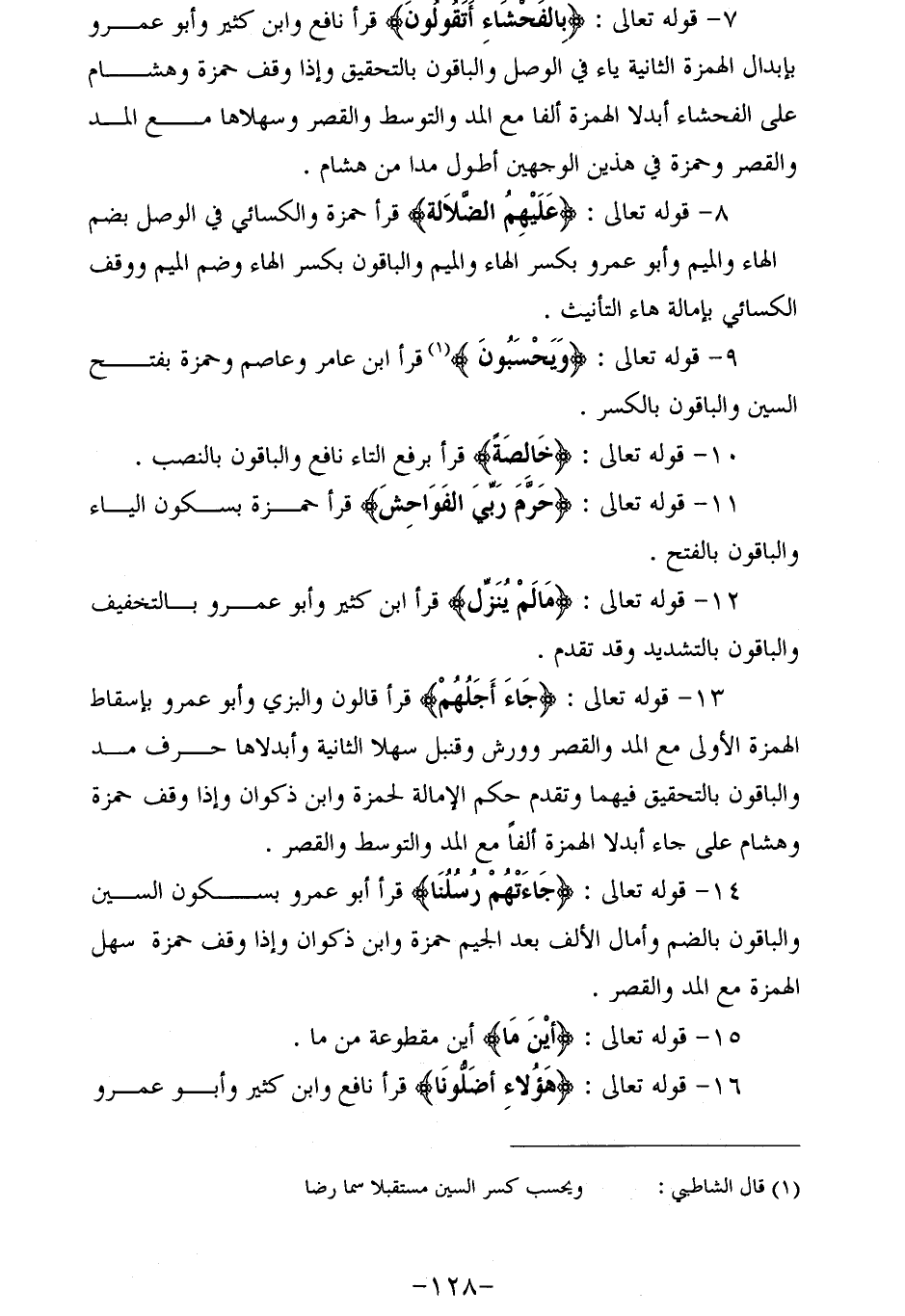 7 - قوله تعالى: بِالْفَحْشاءِ أَتَقُولُونَ قرأ نافع وابن كثير وأبو عمرو بإبدال الهمزة الثانية ياء في الوصل والباقون بالتحقيق وإذا وقف حمزة وهشام على الفحشاء أبدلا الهمزة ألفا مع المد والتوسط والقصر وسهلاها مع المد والقصر وحمزة في هذين الوجهين أطول مدا من هشام.