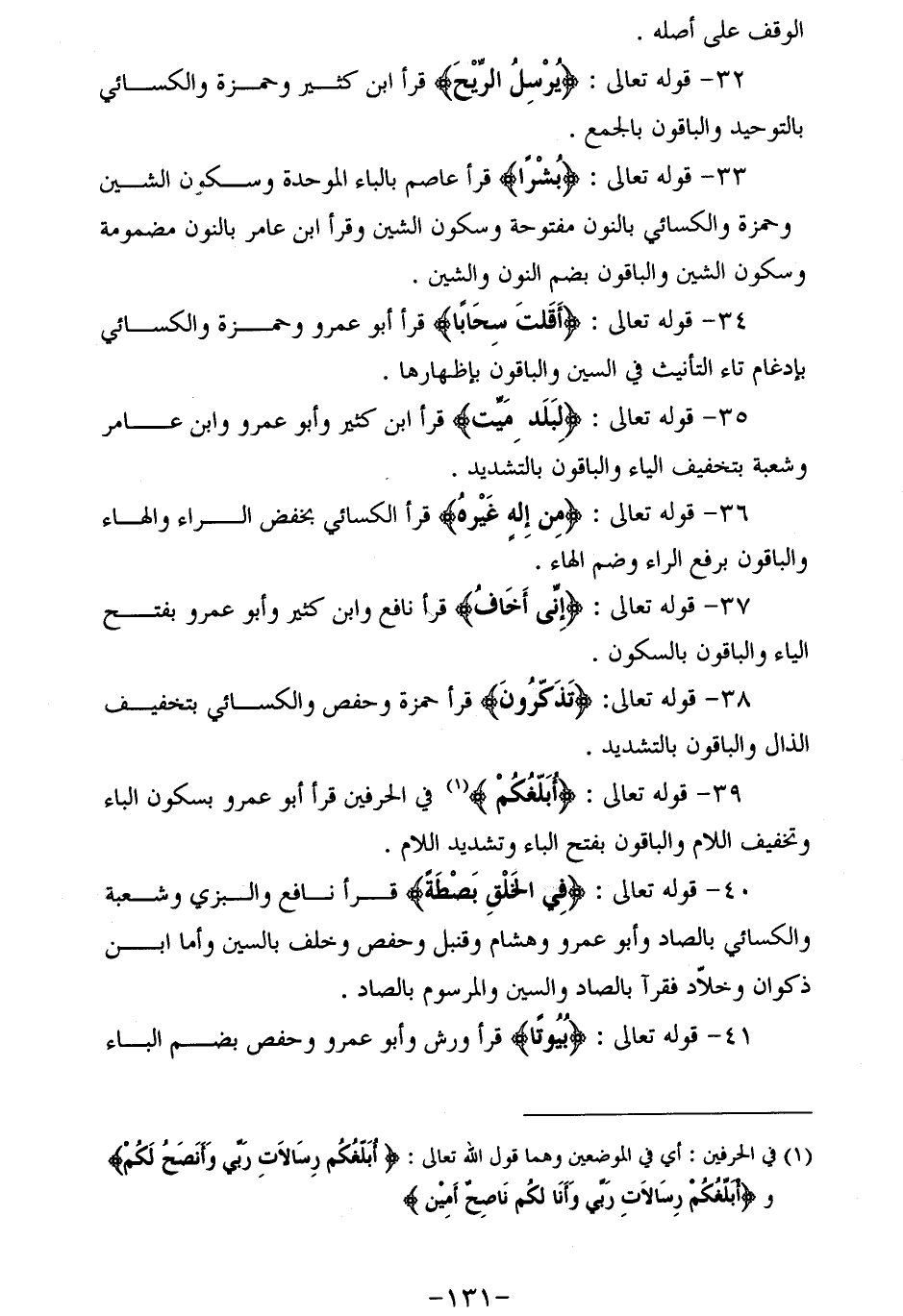 39 - قوله تعالى: أُبَلِّغُكُمْ (¬1) في الحرفين قرأ أبو عمرو بسكون الباء وتخفيف اللام والباقون بفتح الباء وتشديد اللام.