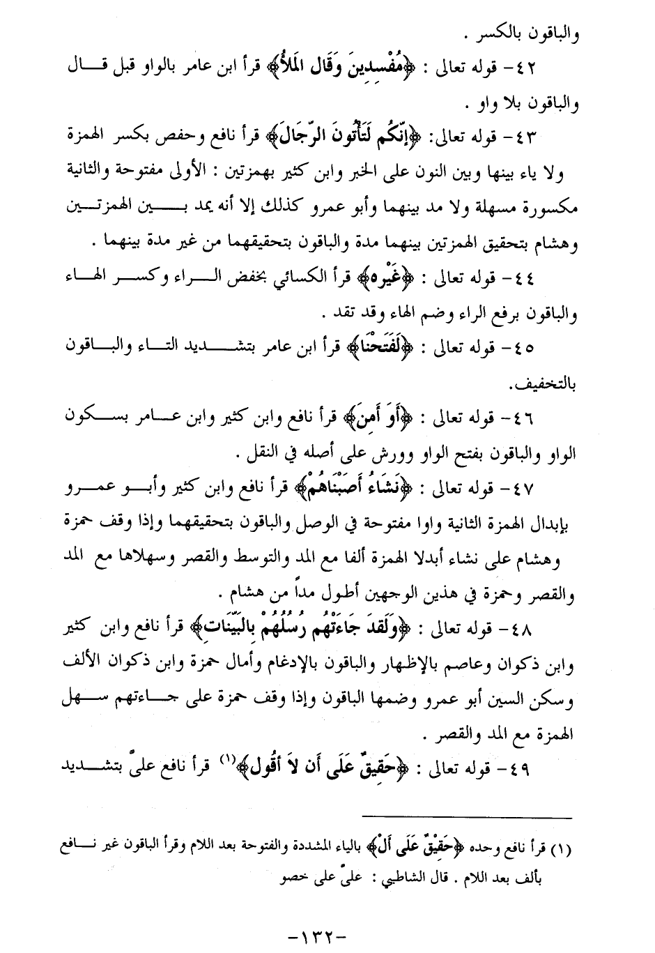 43 - قوله تعالى: إِنَّكُمْ لَتَأْتُونَ الرِّجالَ قرأ نافع وحفص بكسر الهمزة ولا ياء بينها وبين النون على الخبر وابن كثير بهمزتين: الأولى مفتوحة والثانية مكسورة مسهلة ولا مد بينهما وأبو عمرو كذلك إلا أنه يمد بين الهمزتين وهشام بتحقيق الهمزتين بينهما مدة والباقون بتحقيقهما من غير مدة بينهما.