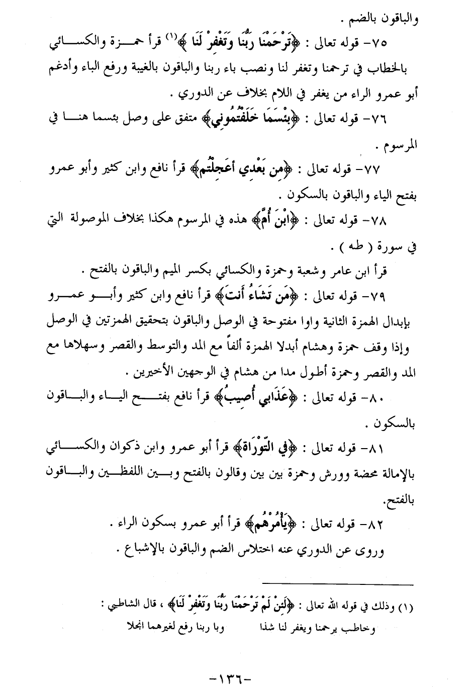 75 - قوله تعالى: (ترحمنا ربّنا وتغفر لنا) (¬1) قرأ حمزة والكسائي بالخطاب في ترحمنا وتغفر لنا ونصب باء ربنا والباقون بالغيبة ورفع الباء وأدغم أبو عمرو الراء من يغفر في اللام بخلاف عن الدوري.