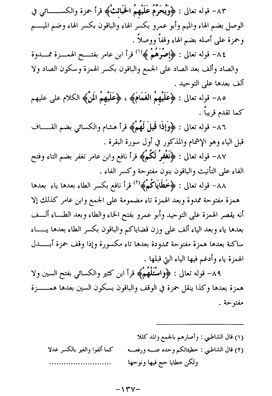 84 - قوله تعالى: إِصْرَهُمْ (¬1) قرأ ابن عامر بفتح الهمزة ممدودة والصاد وألف بعد الصاد على الجمع والباقون بكسر الهمزة وسكون الصاد ولا ألف بعدها على التوحيد.