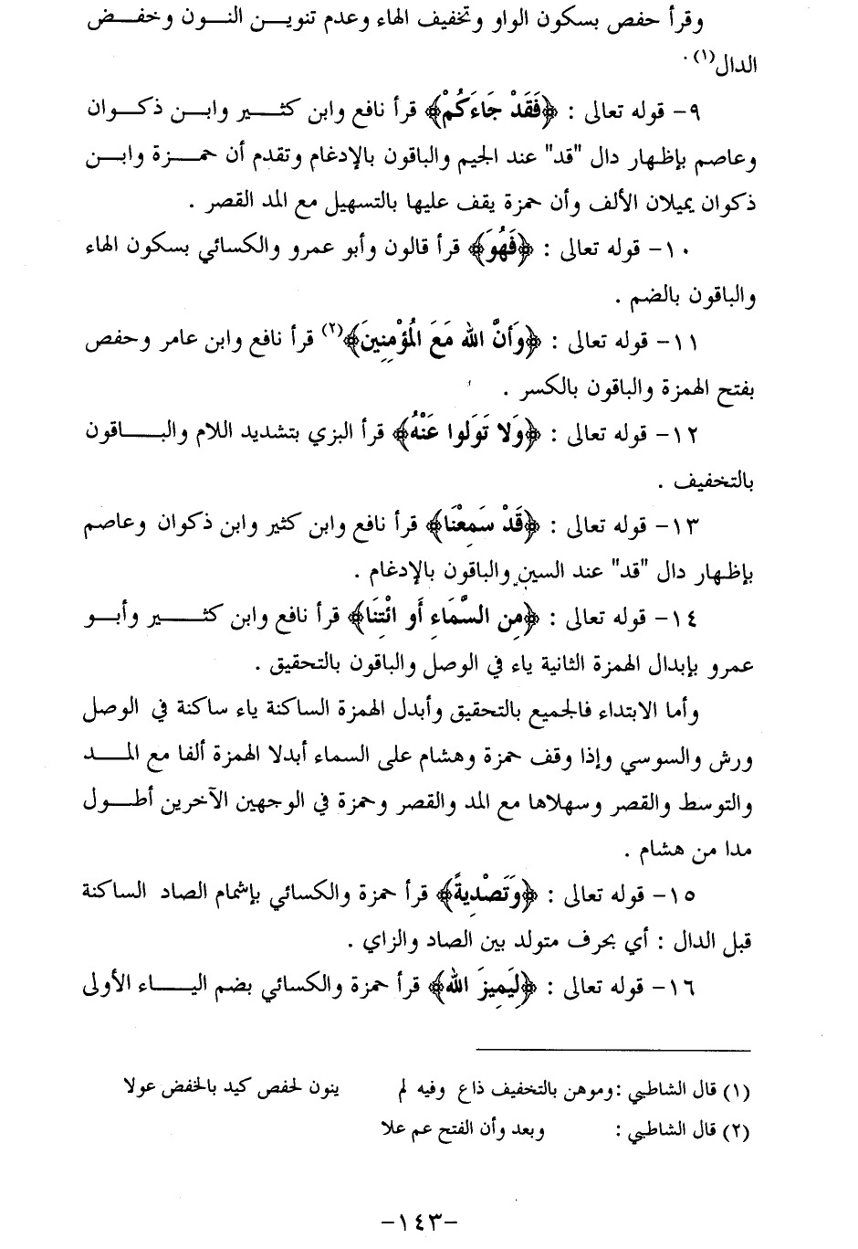 9 - قوله تعالى: فَقَدْ جاءَكُمُ قرأ نافع وابن كثير وابن ذكوان وعاصم بإظهار دال" قد" عند الجيم والباقون بالإدغام وتقدم أن حمزة وابن ذكوان يميلان الألف وأن حمزة يقف عليها بالتسهيل مع المد القصر.
