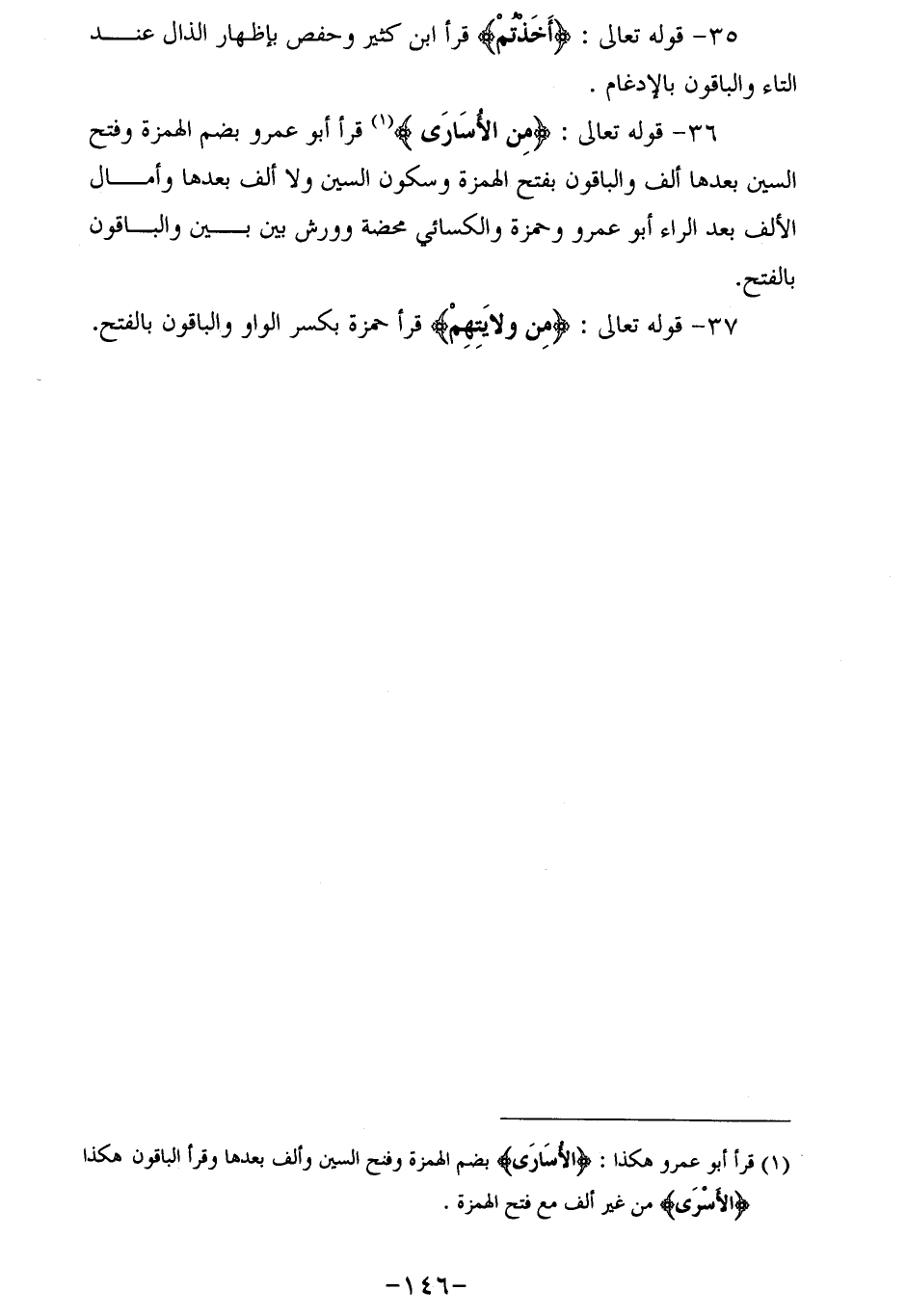 36 - قوله تعالى: (من الأسارى) (¬1) قرأ أبو عمرو بضم الهمزة وفتح السين بعدها ألف والباقون بفتح الهمزة وسكون السين ولا ألف بعدها وأمال الألف بعد الراء أبو عمرو وحمزة والكسائي محضة وورش بين بين والباقون بالفتح.