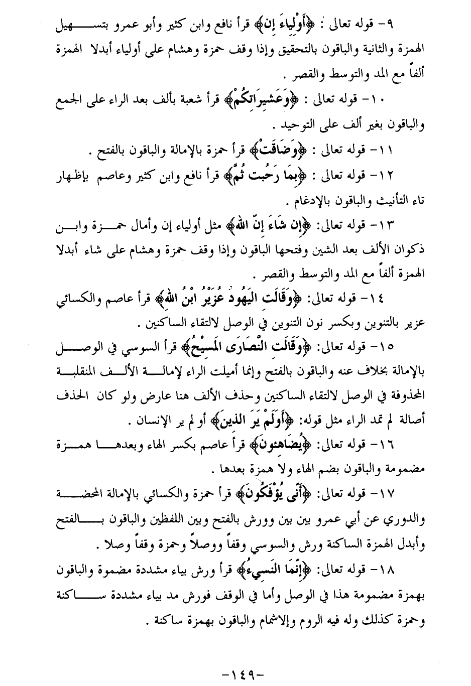 18 - قوله تعالى: إِنَّمَا النَّسِيءُ قرأ ورش بياء مشددة مضمومة والباقون بهمزة مضمومة هذا في الوصل وأما في الوقف فورش مد بياء مشددة ساكنة وحمزة كذلك وله فيه الروم والإشمام والباقون بهمزة ساكنة.