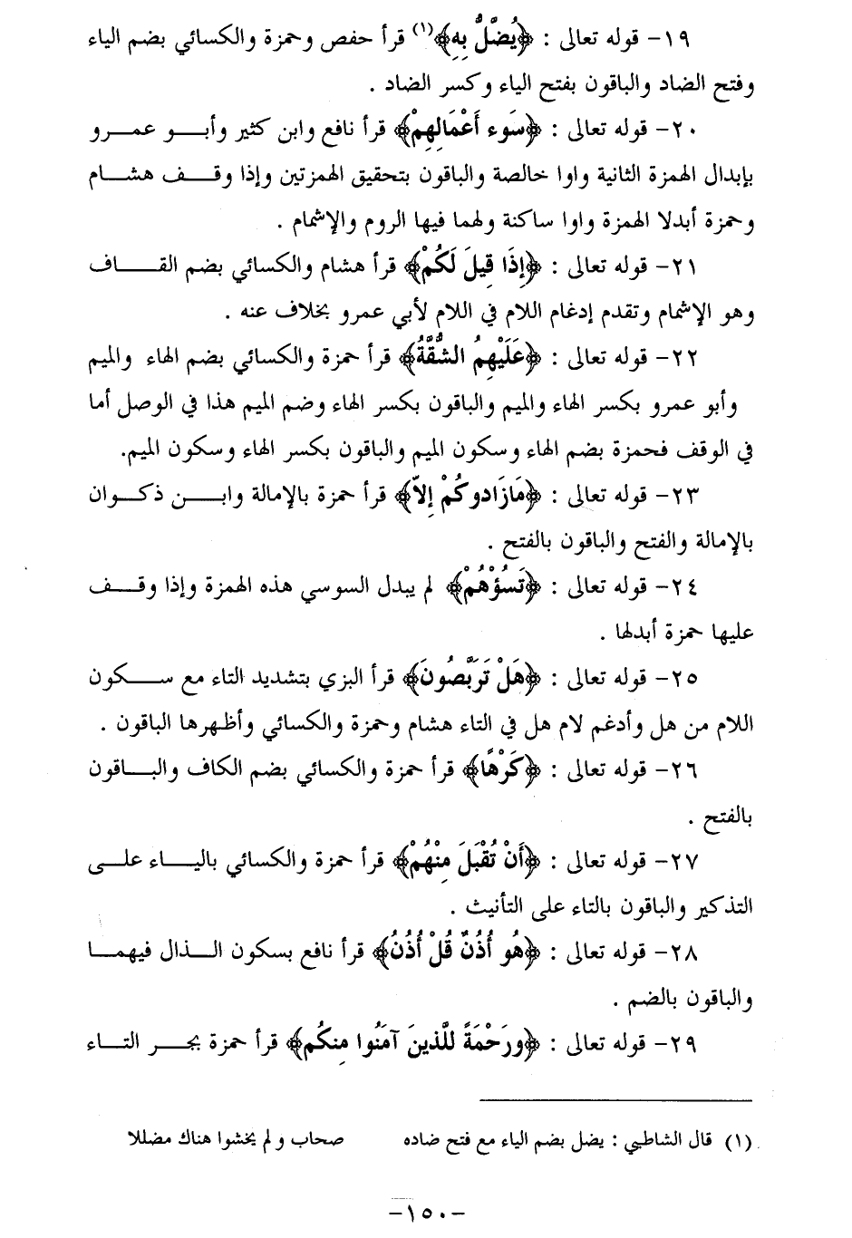 19 - قوله تعالى: يُضَلُّ بِهِ (¬1) قرأ حفص وحمزة والكسائي بضم الياء وفتح الضاد والباقون بفتح الياء وكسر الضاد.