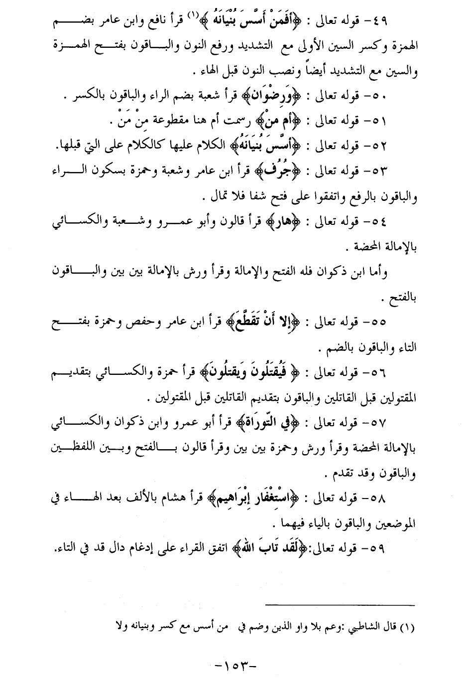 49 - قوله تعالى: أَفَمَنْ أَسَّسَ بُنْيانَهُ (¬1) قرأ نافع وابن عامر بضم الهمزة وكسر السين الأولى مع التشديد ورفع النون والباقون بفتح الهمزة والسين مع التشديد أيضا ونصب النون قبل الهاء.