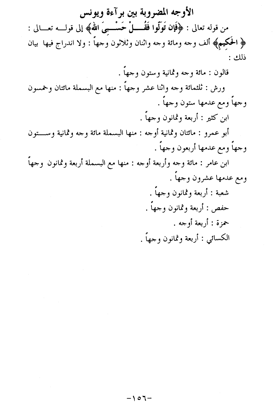 ابن عامر: مائة وجه وأربعة أوجه: منها مع البسملة أربعة وثمانون وجها ومع عدمها عشرون وجها.