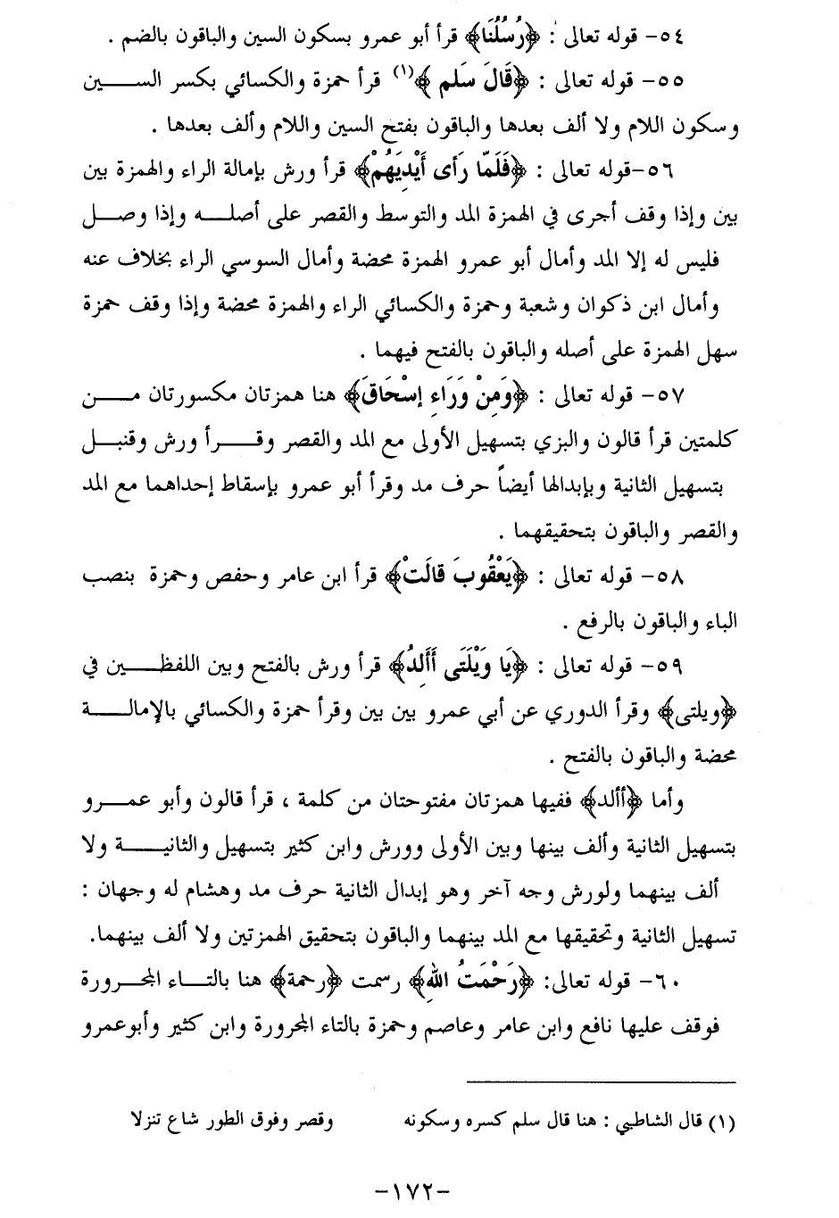 56 - قوله تعالى: فَلَمَّا رَأى أَيْدِيَهُمْ قرأ ورش بإمالة الراء والهمزة بين بين وإذا وقف أجرى في الهمزة المد والتوسط والقصر على أصله وإذا وصل فليس له إلا المد وأمال أبو عمرو الهمزة محضة وأمال السوسي الراء بخلاف عنه وأمال ابن ذكوان وشعبة وحمزة والكسائي الراء والهمزة محضة وإذا وقف حمزة سهل الهمزة على أصله والباقون بالفتح فيهما.